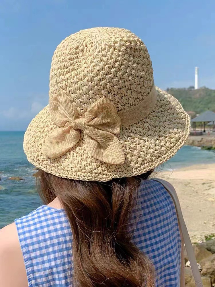Product category: straw hatApplicable gender: femaleMaterial: StrawHat style: domeHat brim style: big brimColor: Khaki, pink, beige, navySize: one sizeHead Circumference: 55-58cm (One Size)Brim: 10cm