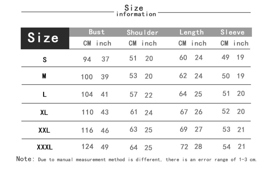 1. Asian sizes are 1 to 2 sizes smaller than European and American people. Choose the larger size if your size between two sizes. Please allow 2-3cm differences due to manual measurement. 2. Please check the size chart carefully before you buy the item, if you don't know how to choose size, please contact our customer service. 3.As you know, the different computers display colors differently, the color of the actual item may vary slightly from the following images.