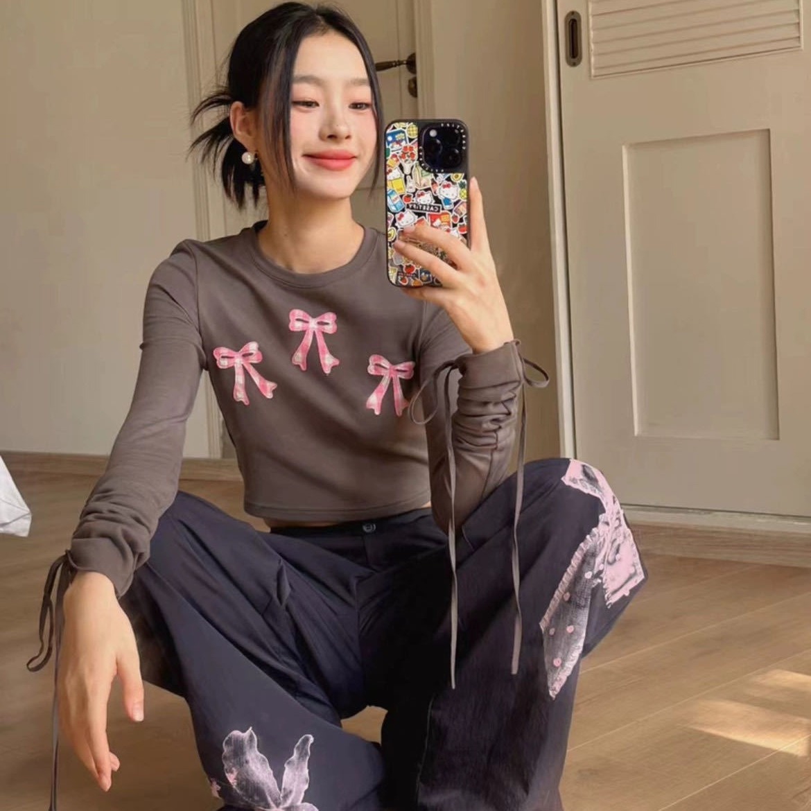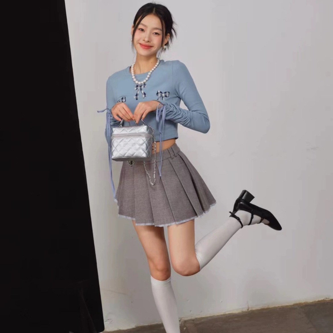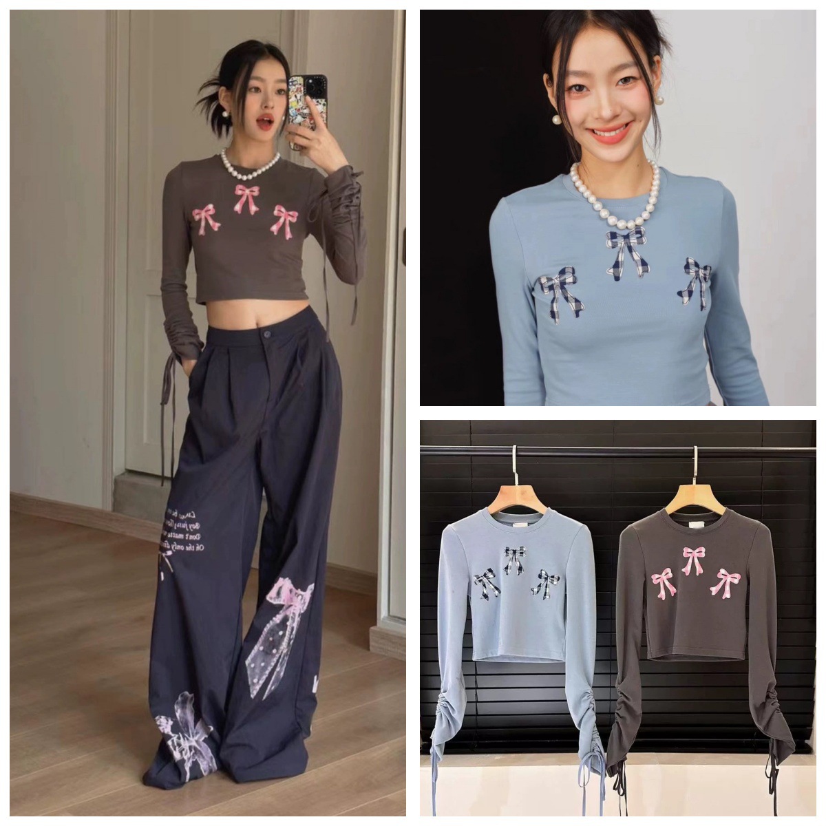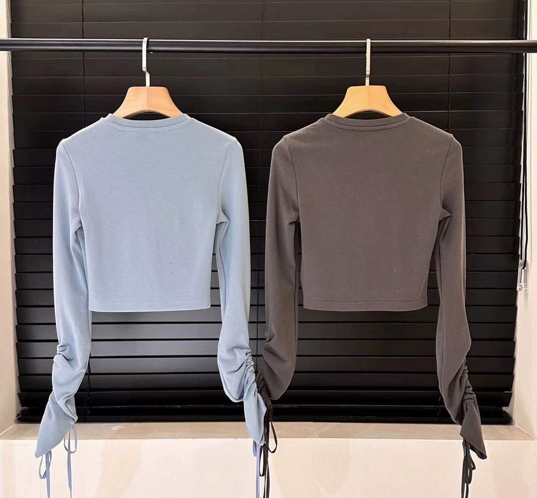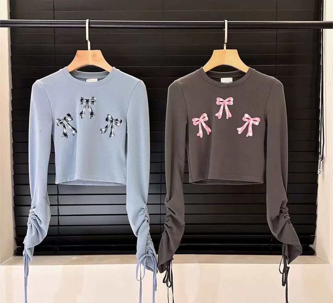 Color: tight bow pleated sleeve brown T-shirt, tight bow pleated sleeve light blue T-shirt