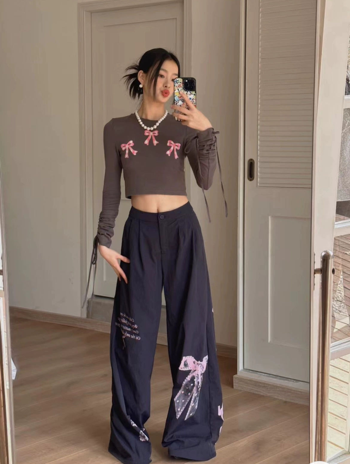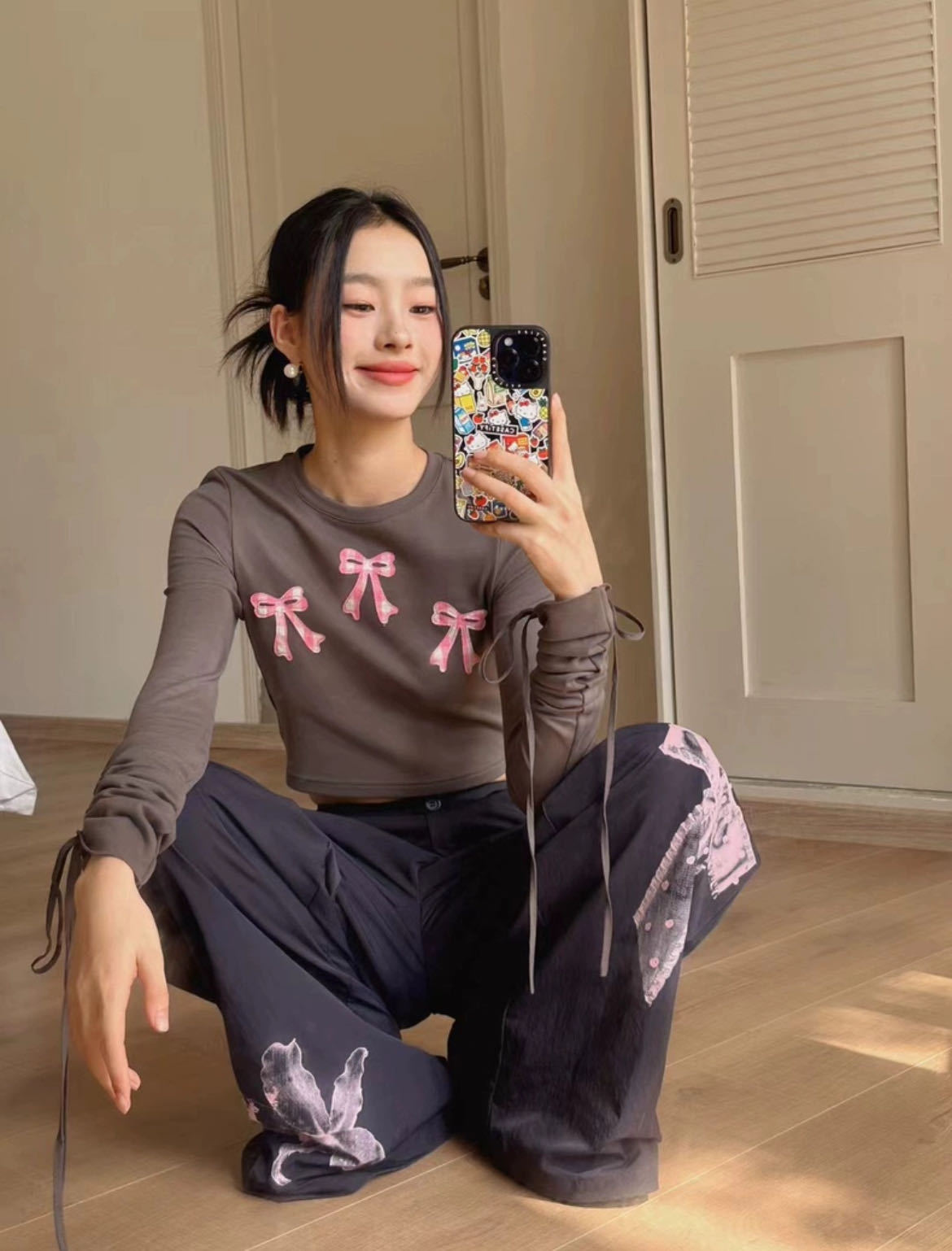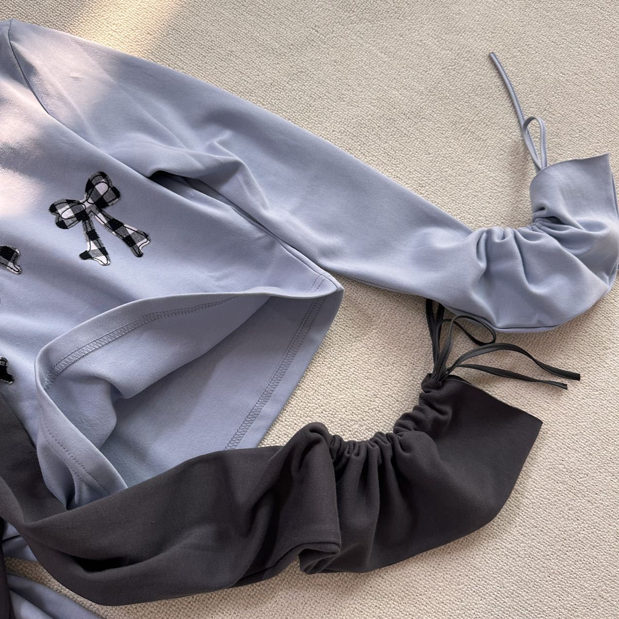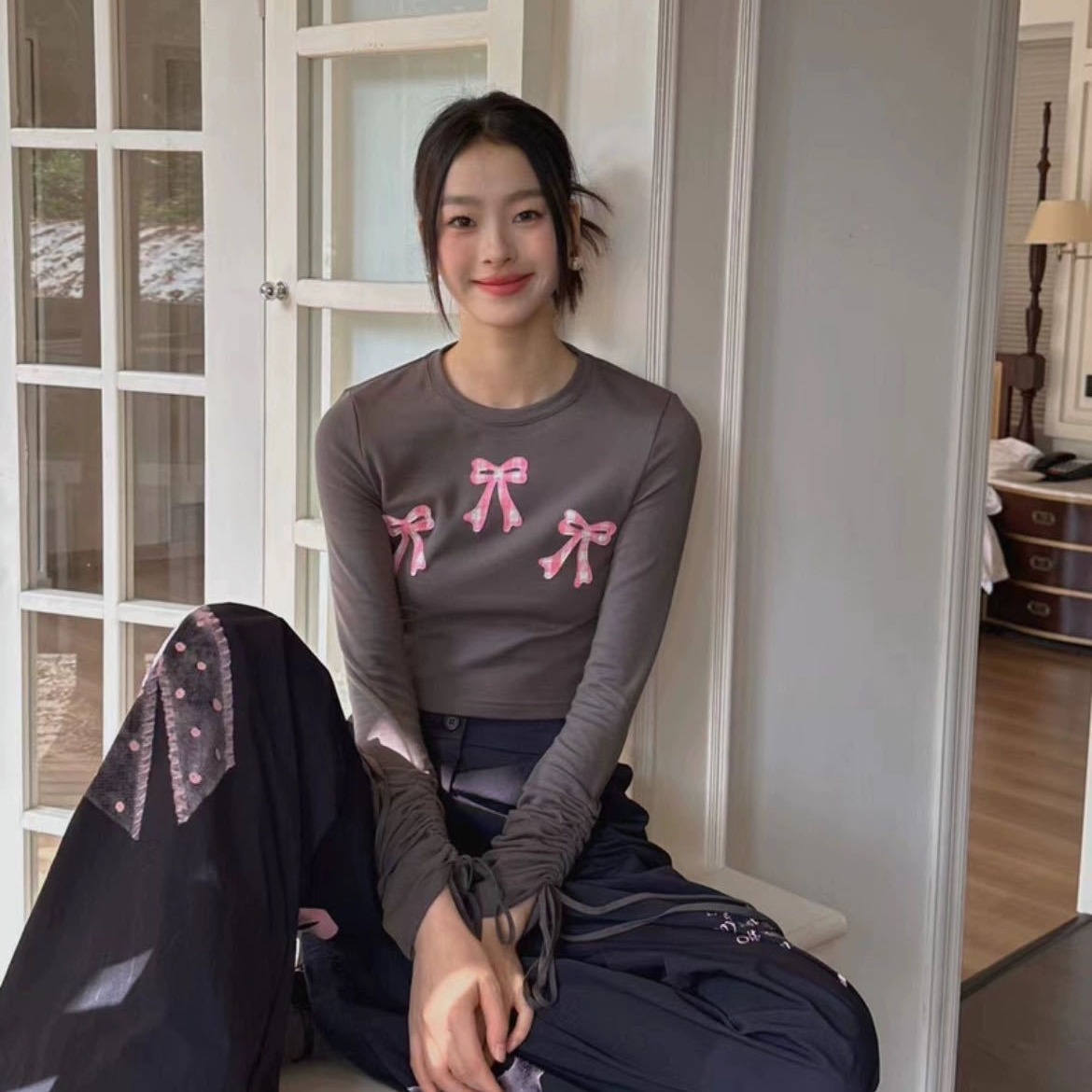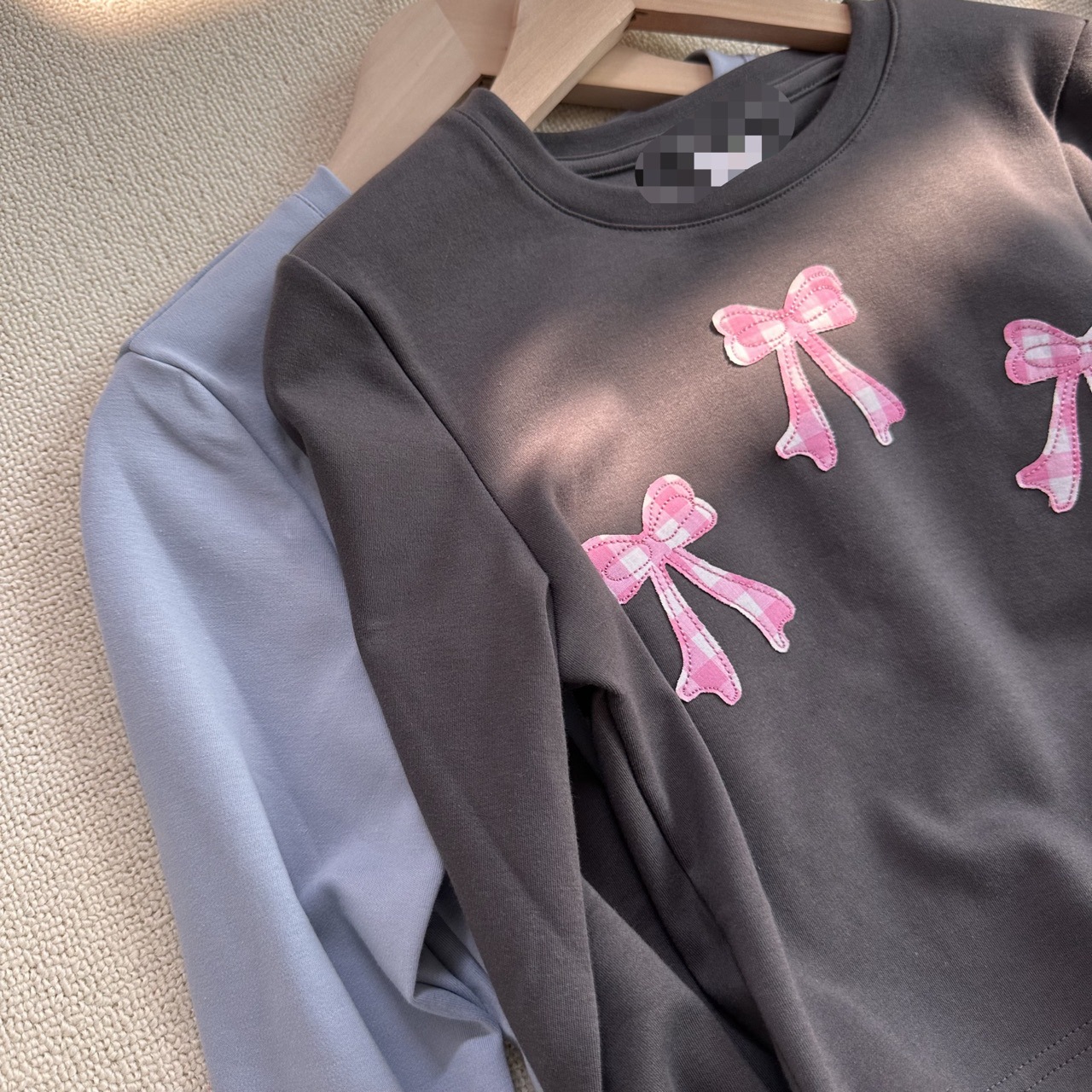 Color: tight bow pleated sleeve brown T-shirt, tight bow pleated sleeve light blue T-shirt