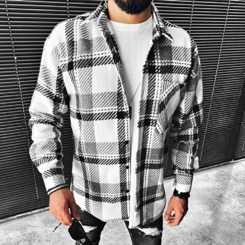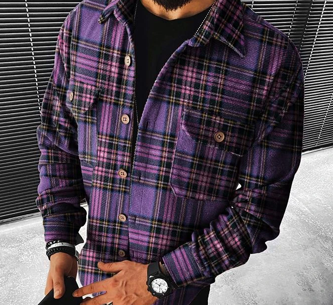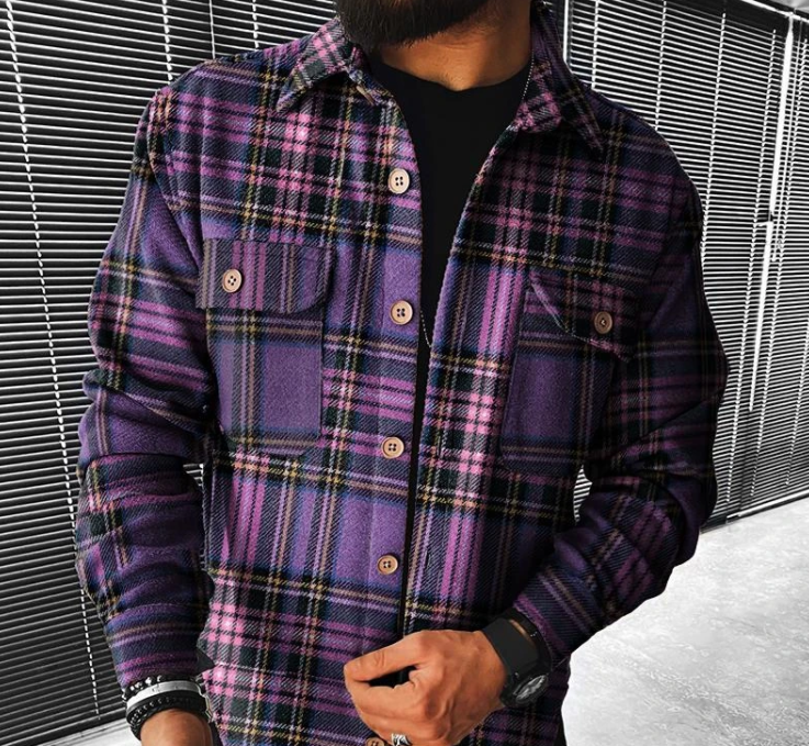 European and American Plaid Pocket Long Sleeve Shirt