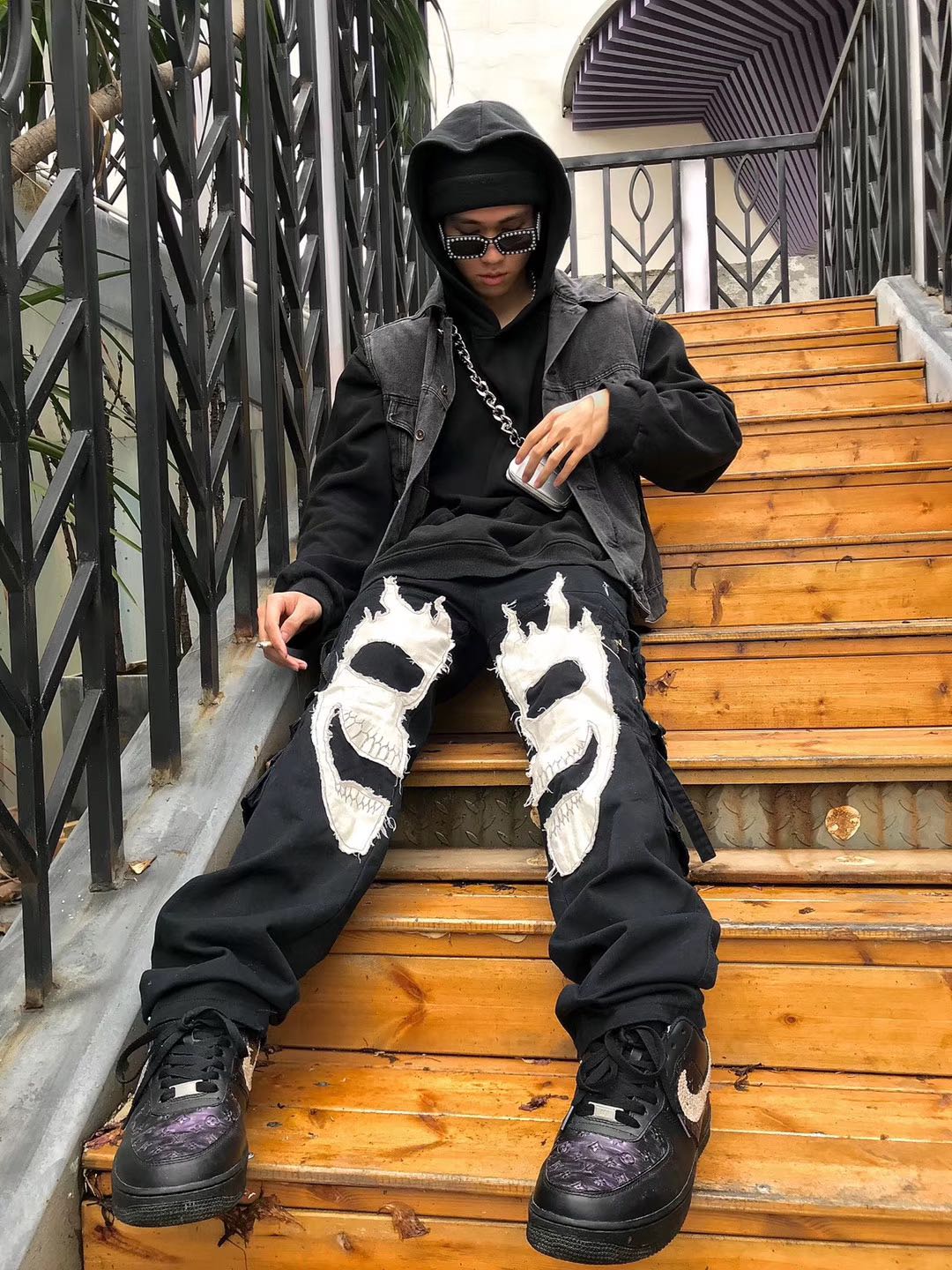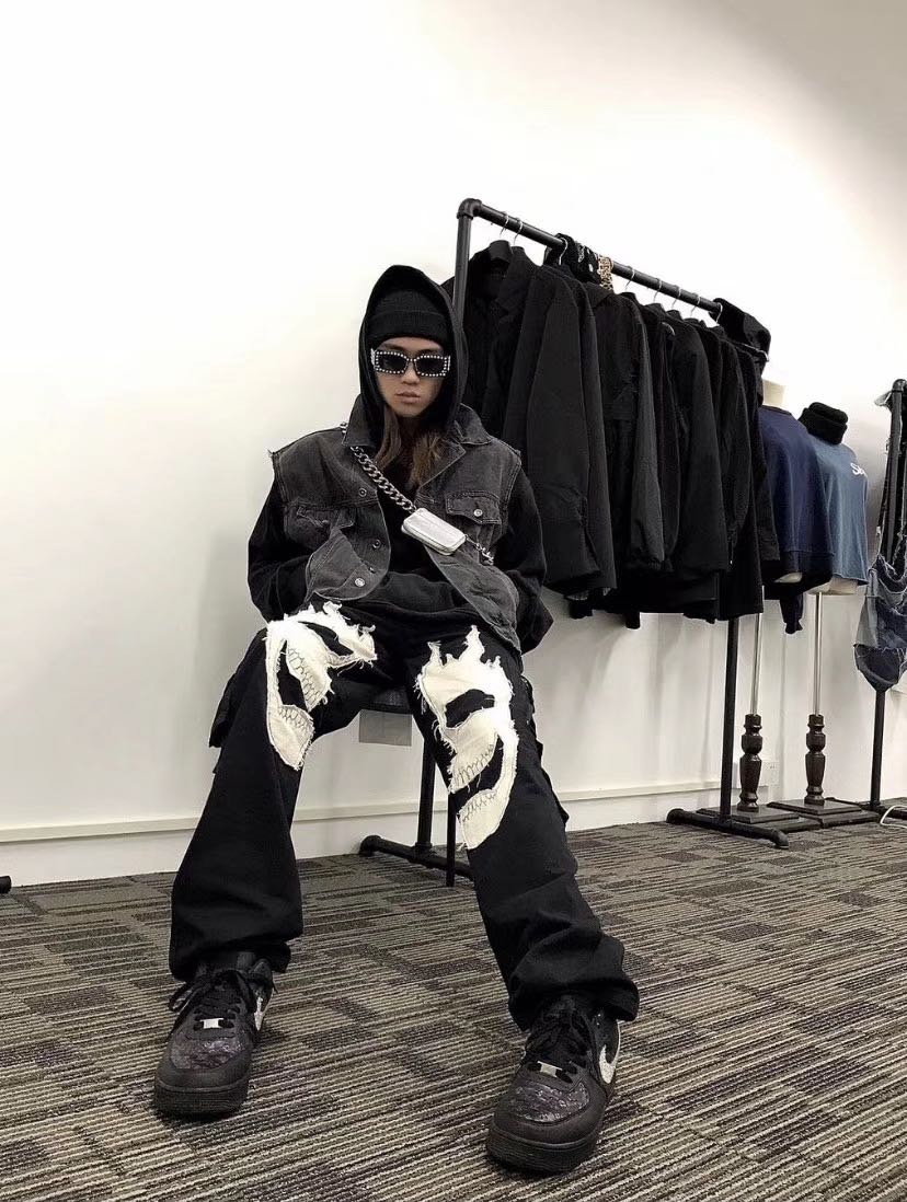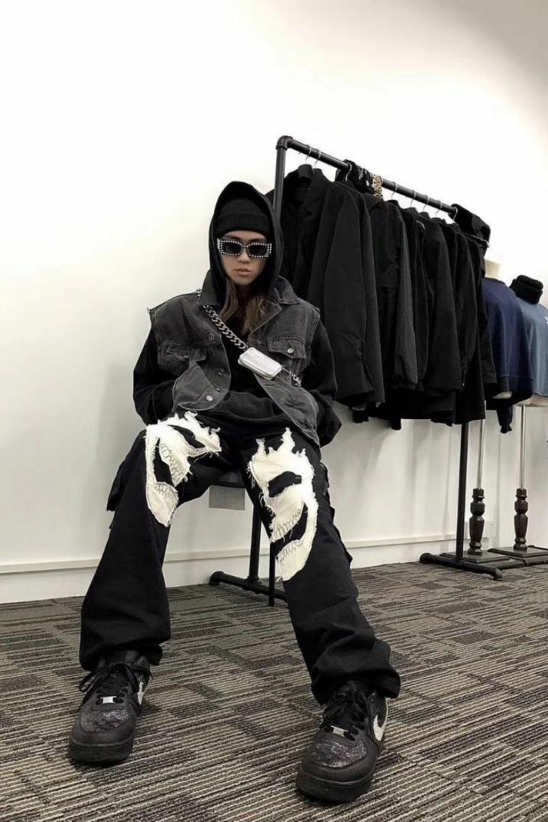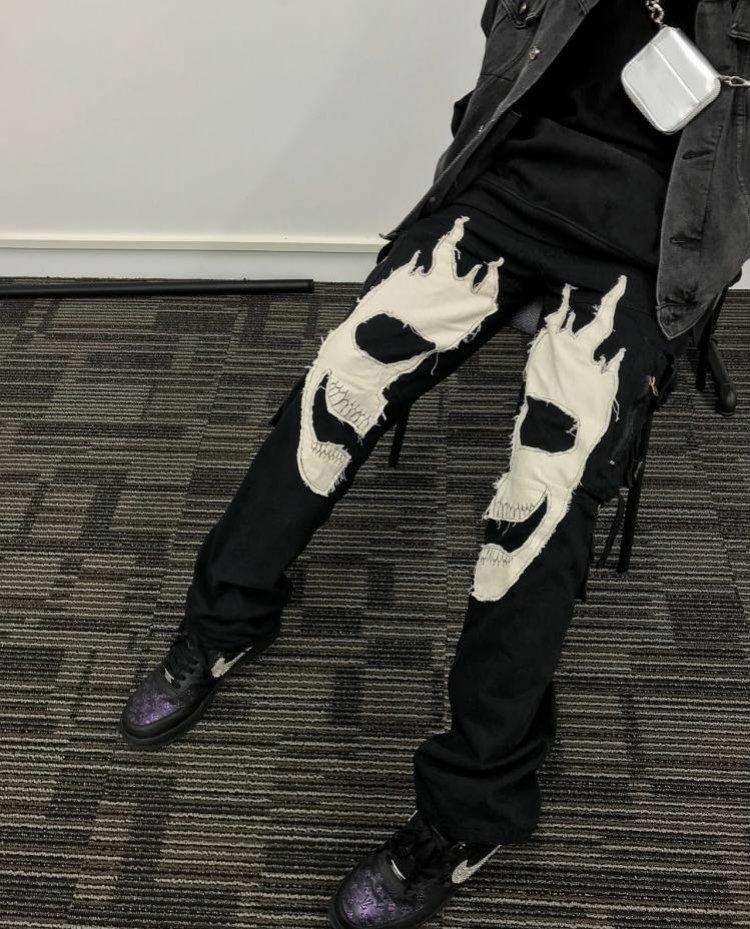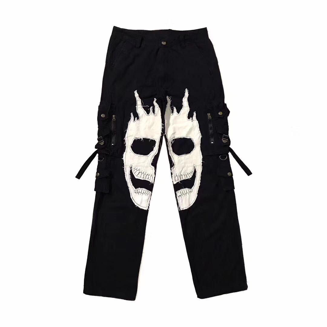 Stitching skull pants multi-pocket functional zipper trousers