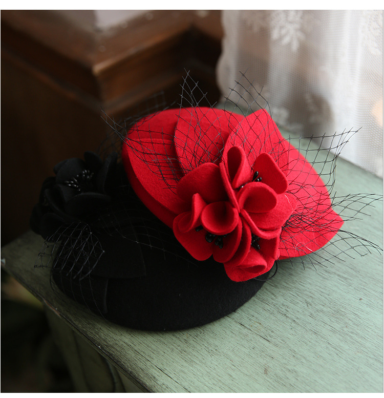 Material: woolStyle: KoreanWeaving method: satinTop style: domeHat style: no eavesColor: red, black, white, dark greenSize: 18 diameter (with hairpin)