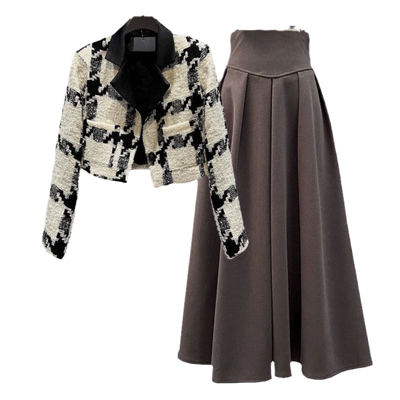 Color: plaid coat black skirt two-piece set, plaid coat khaki skirt two-piece set, plaid coat brown skirt two-piece set, plaid coat one, black skirt one, khaki skirt one, Brown skirt one
