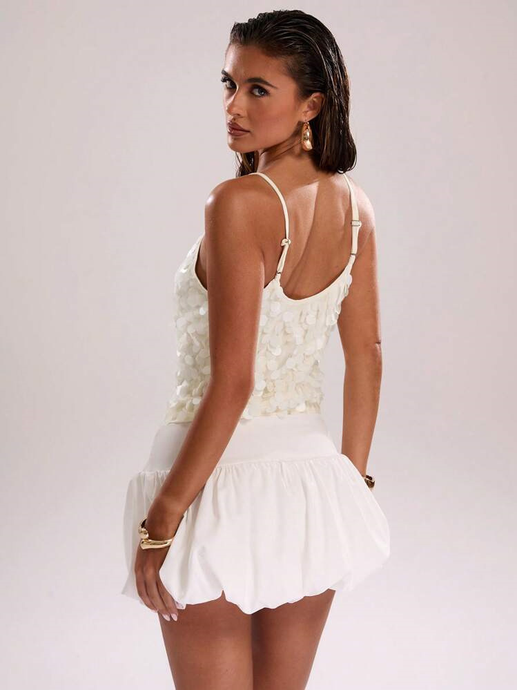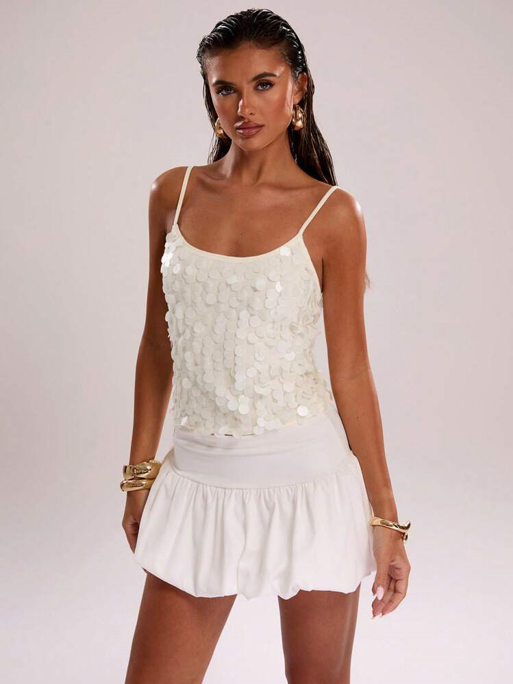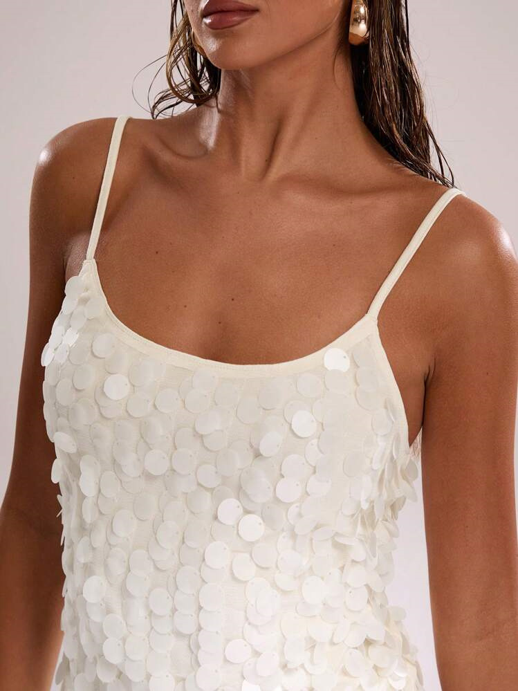 Product information:Color: White Size: S,M,L Style: slim fit Popular elements: Sequins Style: with shoulder strap Main fabric composition: Polyester (polyester fiber) Shoulder strap style: double connector type