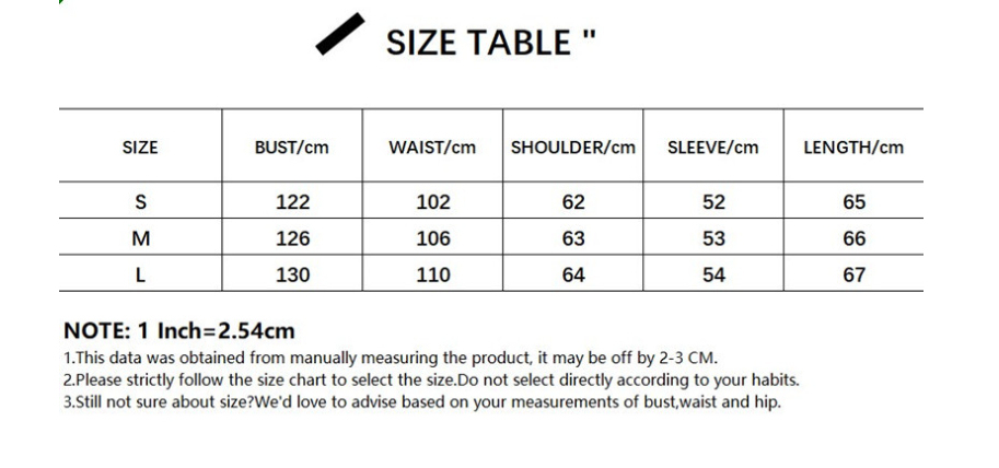 1. Asian sizes are 1 to 2 sizes smaller than European and American people. Choose the larger size if your size between two sizes. Please allow 2-3cm differences due to manual measurement. 2. Please check the size chart carefully before you buy the item, if you don't know how to choose size, please contact our customer service. 3.As you know, the different computers display colors differently, the color of the actual item may vary slightly from the following images.
