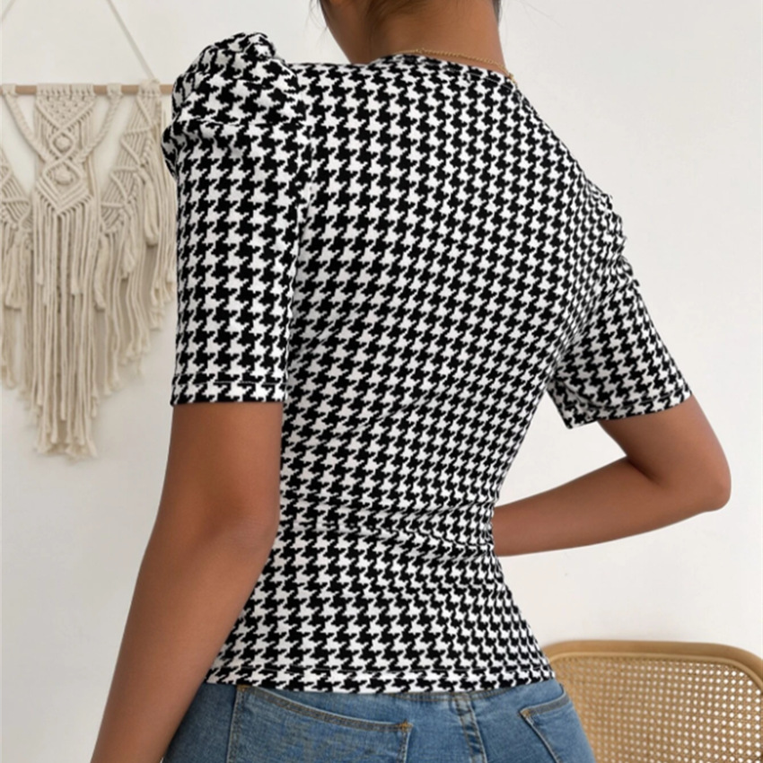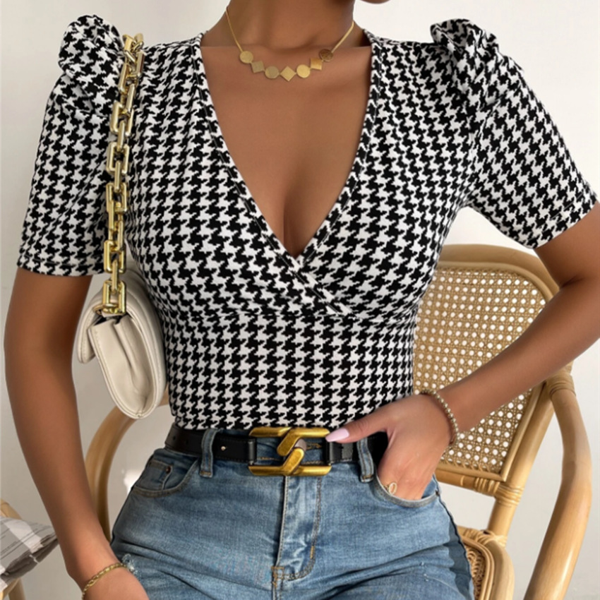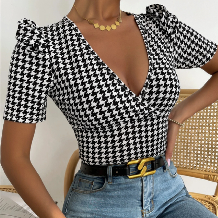 Item number:T03 Black and white Plaid Deep V T-shirt