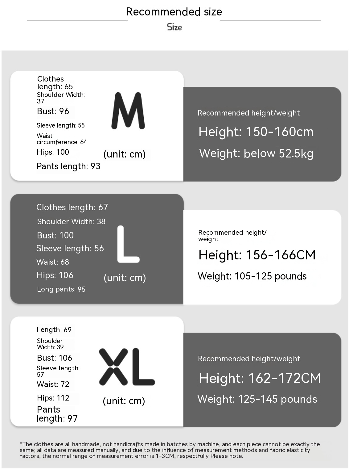 1. Asian sizes are 1 to 2 sizes smaller than European and American people. Choose the larger size if your size between two sizes. Please allow 2-3cm differences due to manual measurement. 2. Please check the size chart carefully before you buy the item, if you don't know how to choose size, please contact our customer service. 3.As you know, the different computers display colors differently, the color of the actual item may vary slightly from the following images.