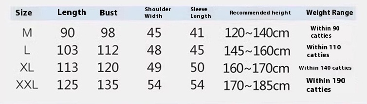 Size: M (children's size) 40.00kg, L (adult) 55.00kg, XL (adult) 70.00kg, XXL (adult) 95.00kg