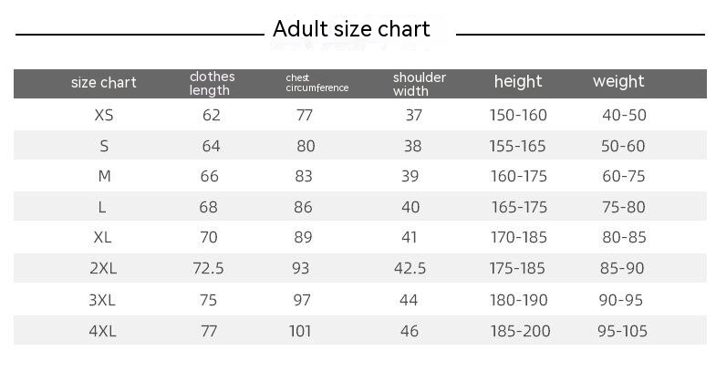 Size: Adult S size, adult M size, adult L size, adult XL size, adult size 2XL, adult size 3XL, adult size 4XL