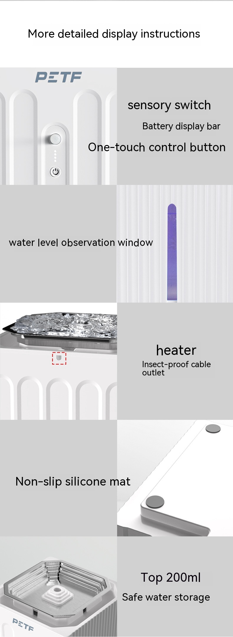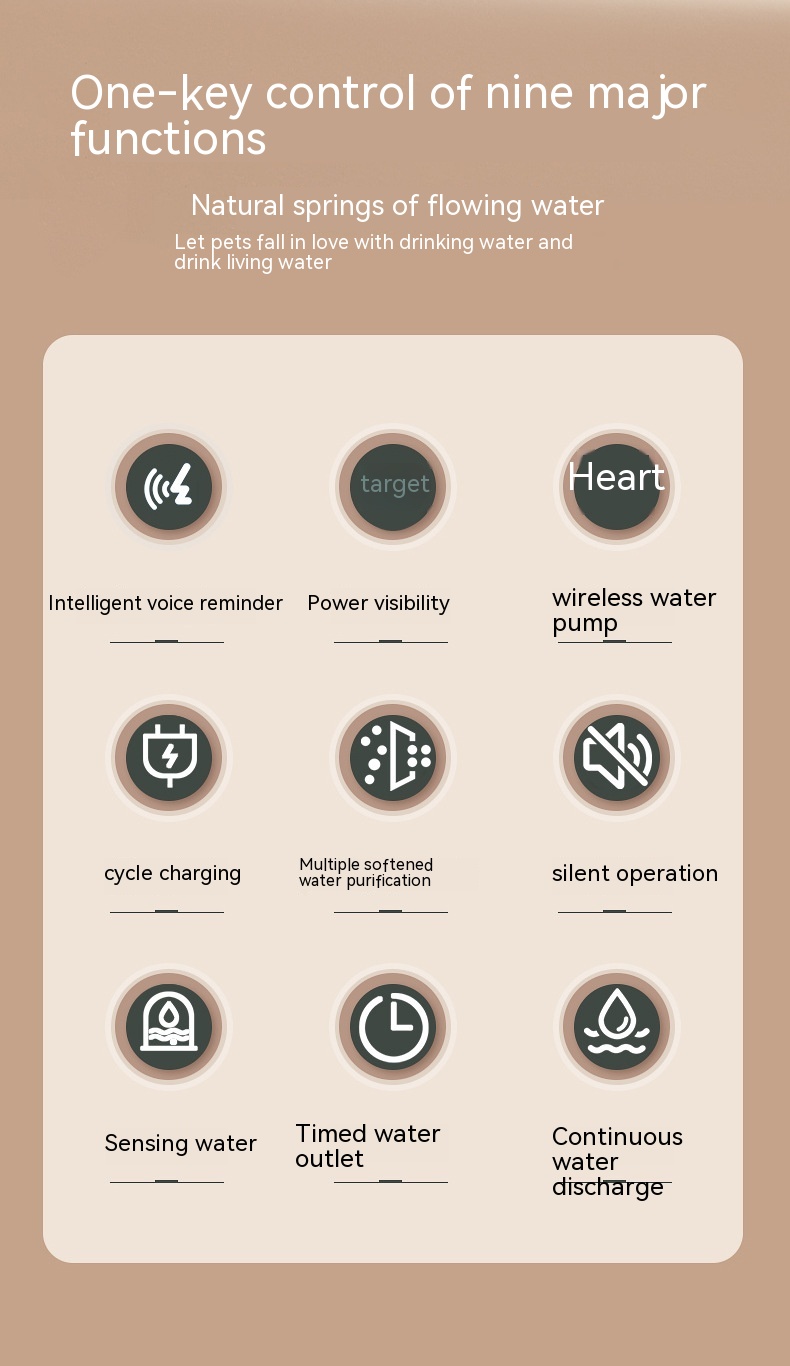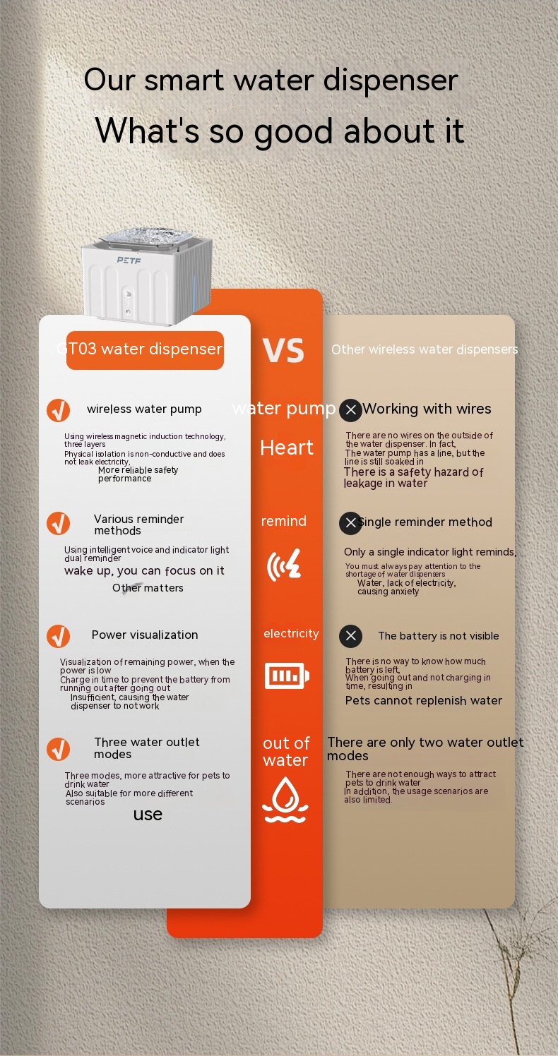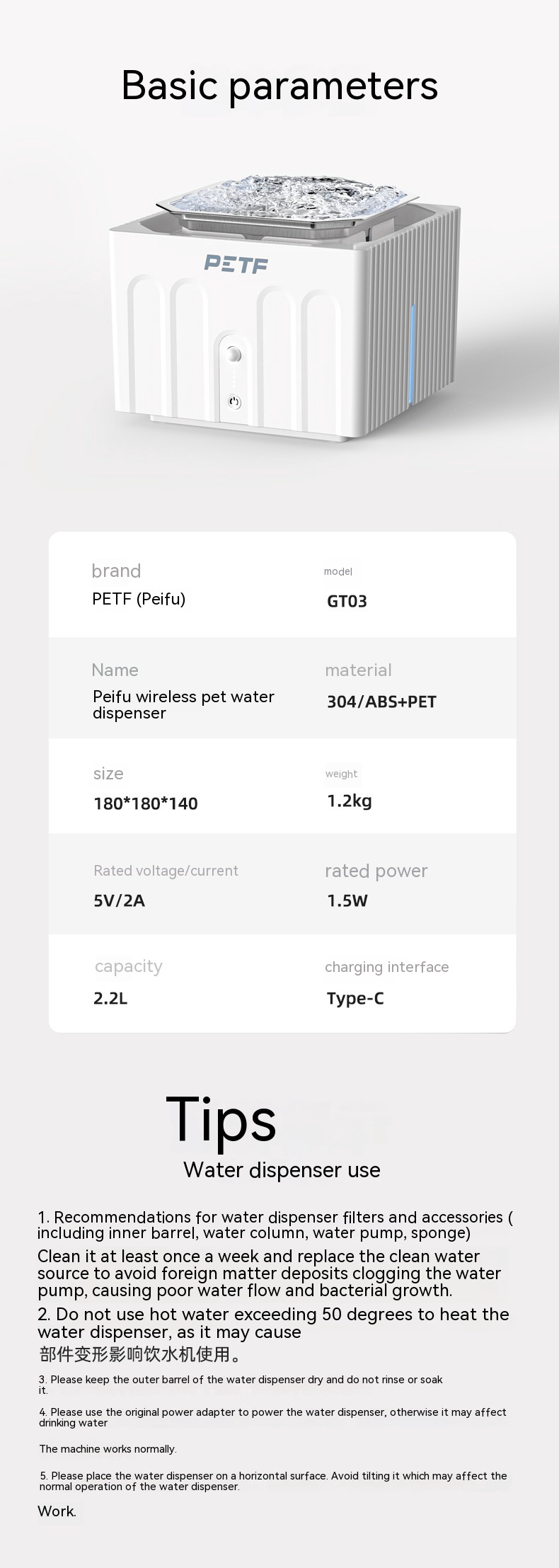 Packing List: water dispenser, charging cable, wireless water pump, filter element, packing box