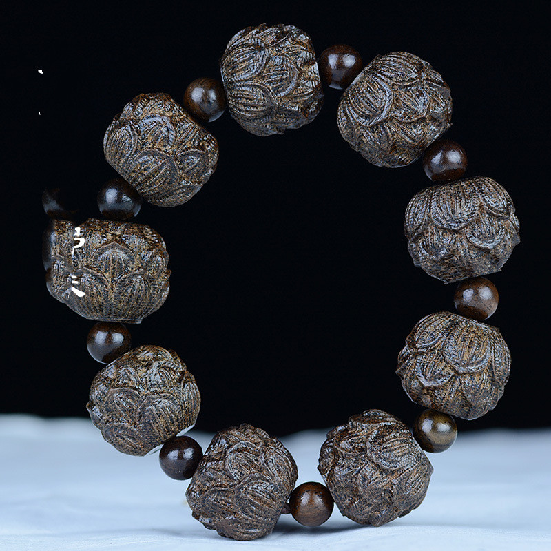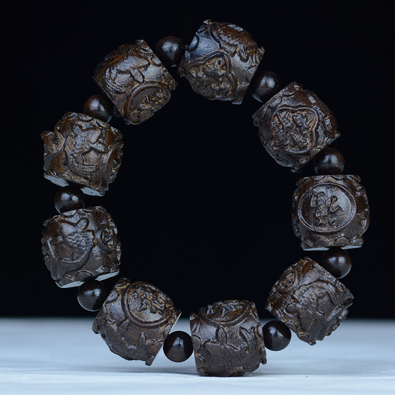 Black Leather Bracelet With Leather Gray Eighteen Arhats Carved Head Beads