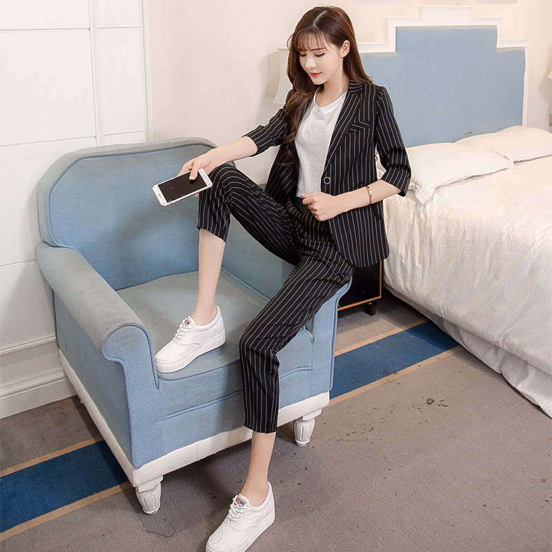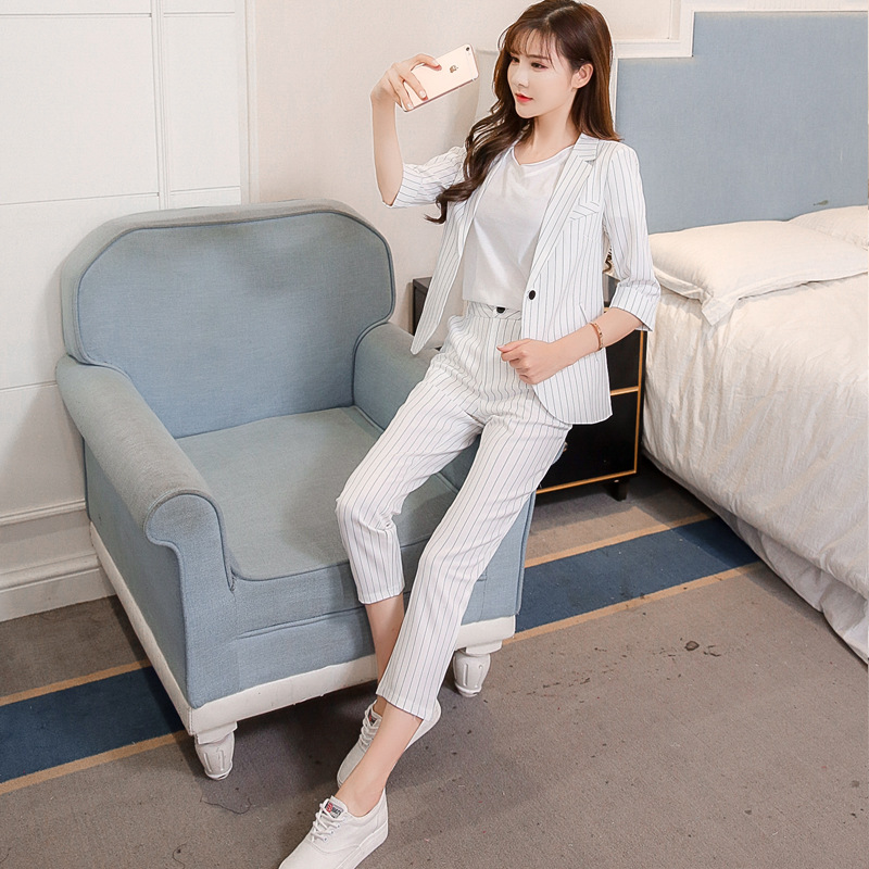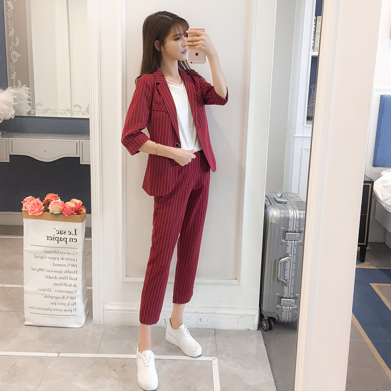 Color: Two-piece burgundy striped small suit, two-piece black striped suit, two-piece white striped suit
