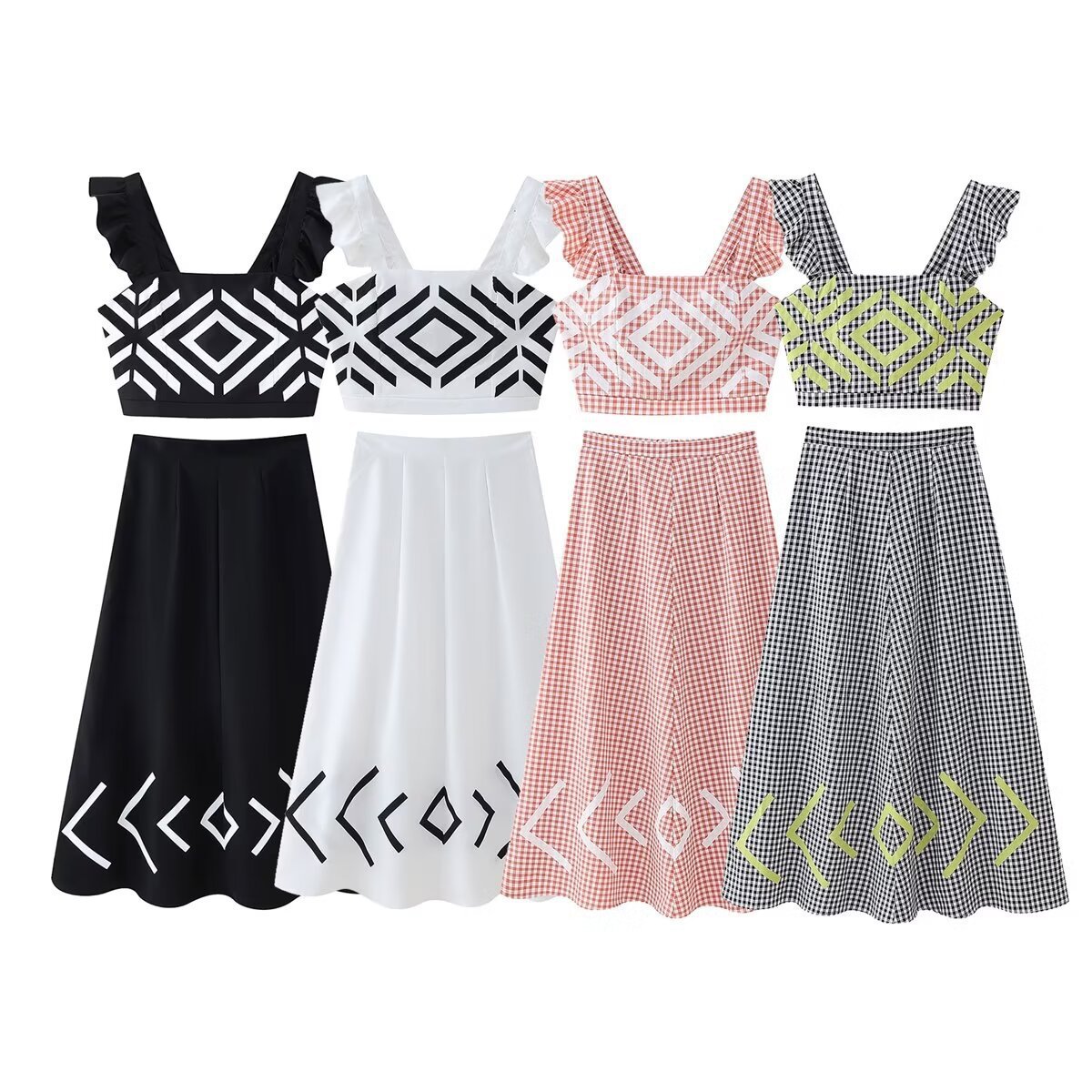 Color: Black plaid top, pink plaid top, black top, white top, black plaid skirt, pink plaid skirt, black skirt, white skirt
