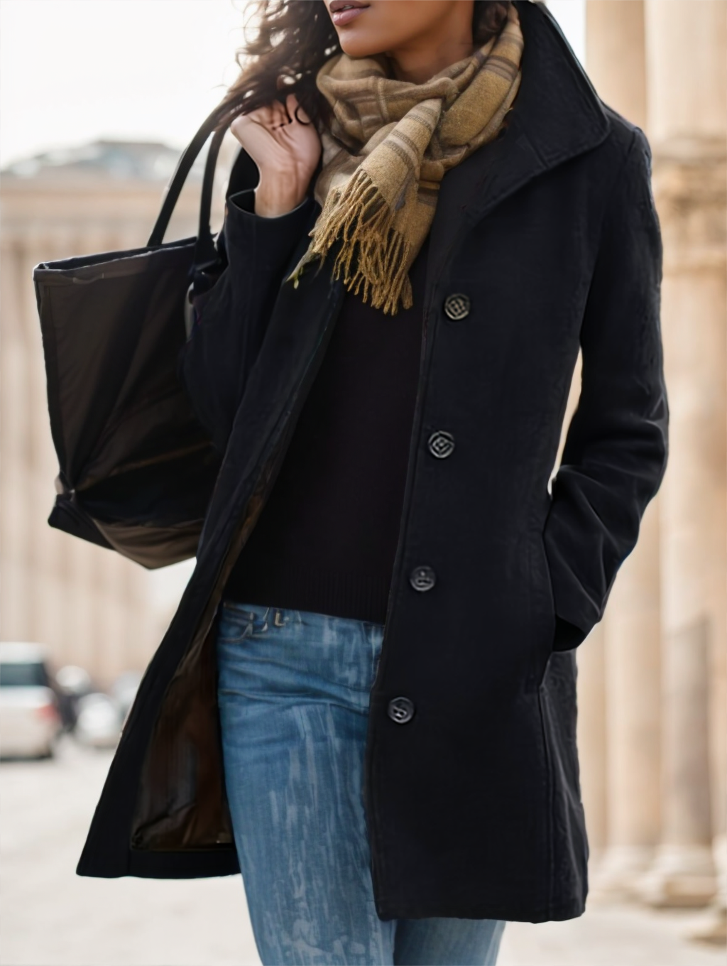 Women's Casual Tweed Coat - Solid Color Mid-Length H-Silhouette Button Front Long Sleeve