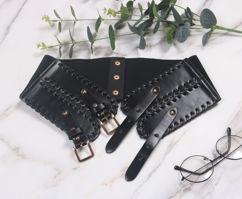 Product Category: Waist SealApplicable gender: femaleApplicable age: youthMaterial: imitation leatherColour: BlackStyle: fashionFeatures: double buckle, weaving