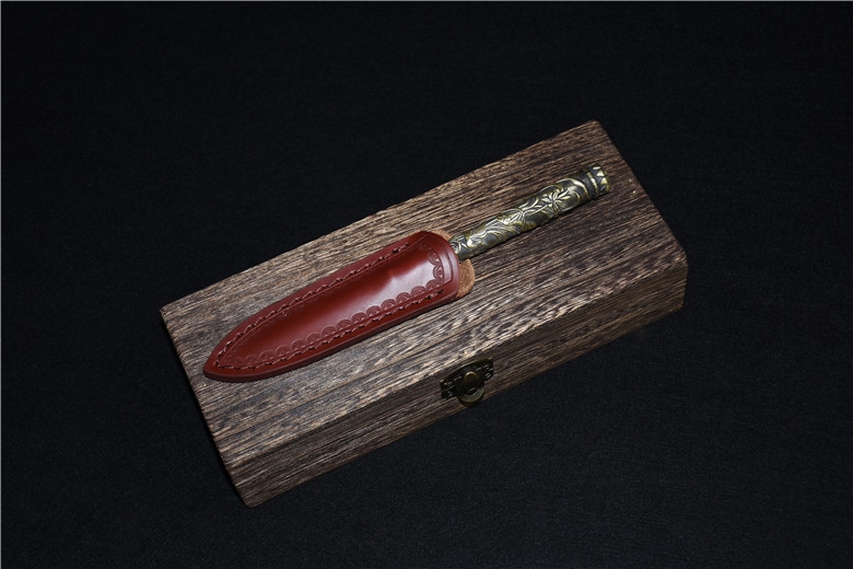 Full length: 195mmBlade length: 68mmBlade width: 14mmMaterial: one-piece pattern steel, copperPacking: leather case, high-grade wooden box, knife