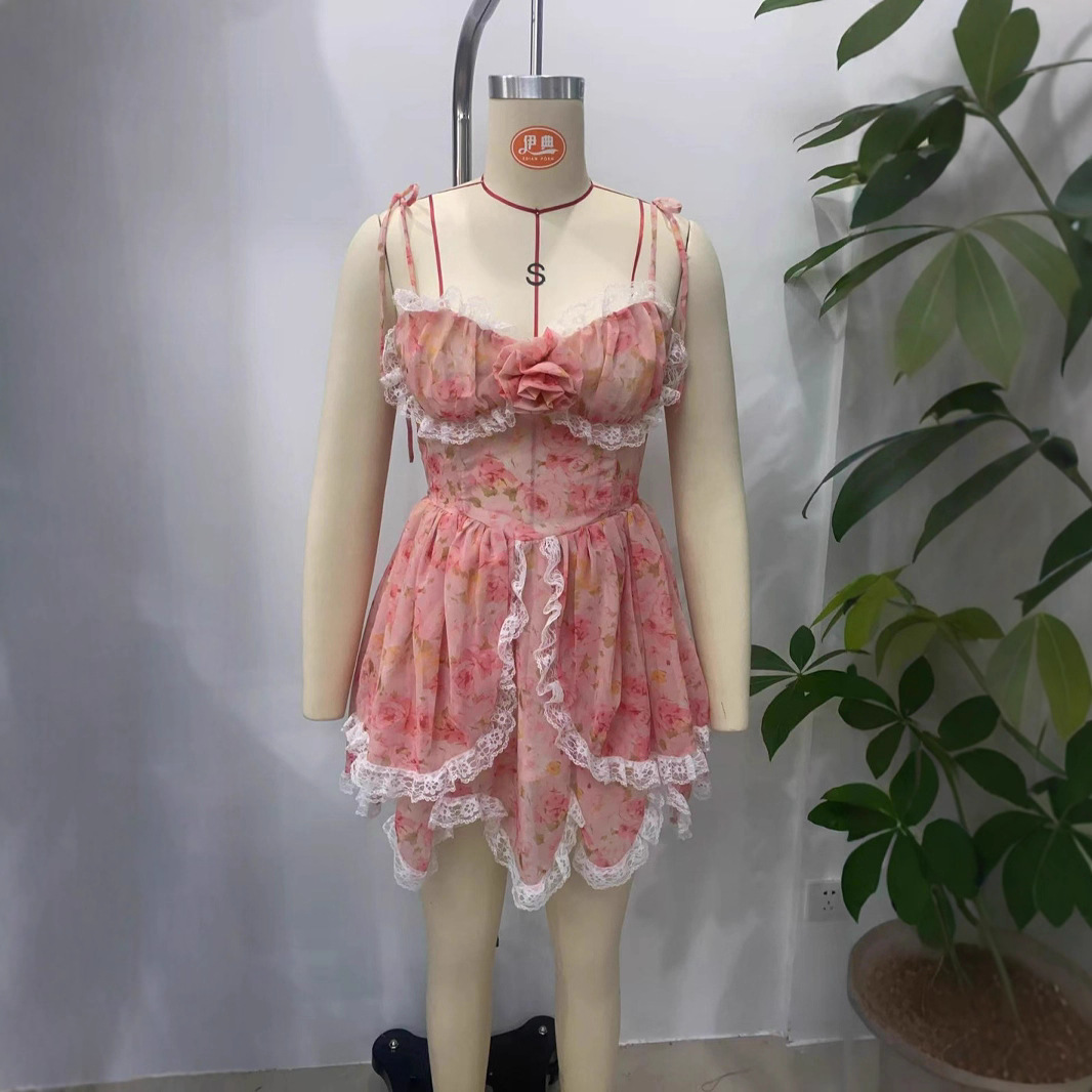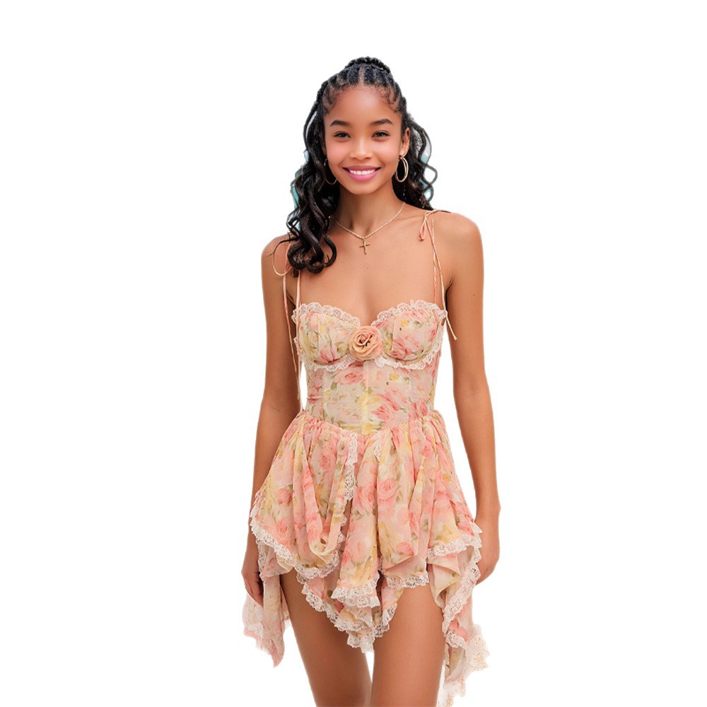 Product information: Pattern: plants and flowers Skirt type: asymmetric skirt Color: lace decoration irregular hem suspender skirt printing Waist type: high waist Size: S,M,L Fabric name: Polyester Skirt Category: Dress