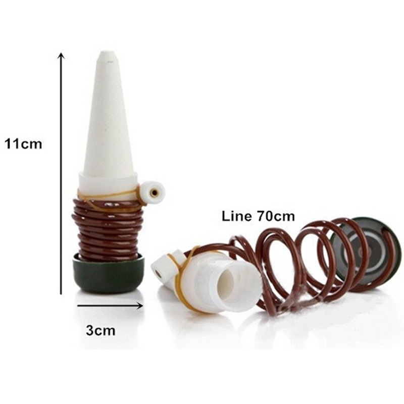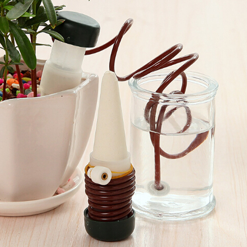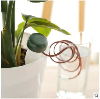 4. Put one-end of the plastic tube into the water container, and insert the white porcelain head part into the soil completely.