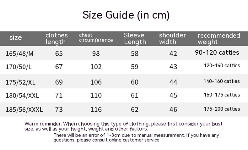 Size: M-165,L-170,XL-175,XXL-180,XXXL-185