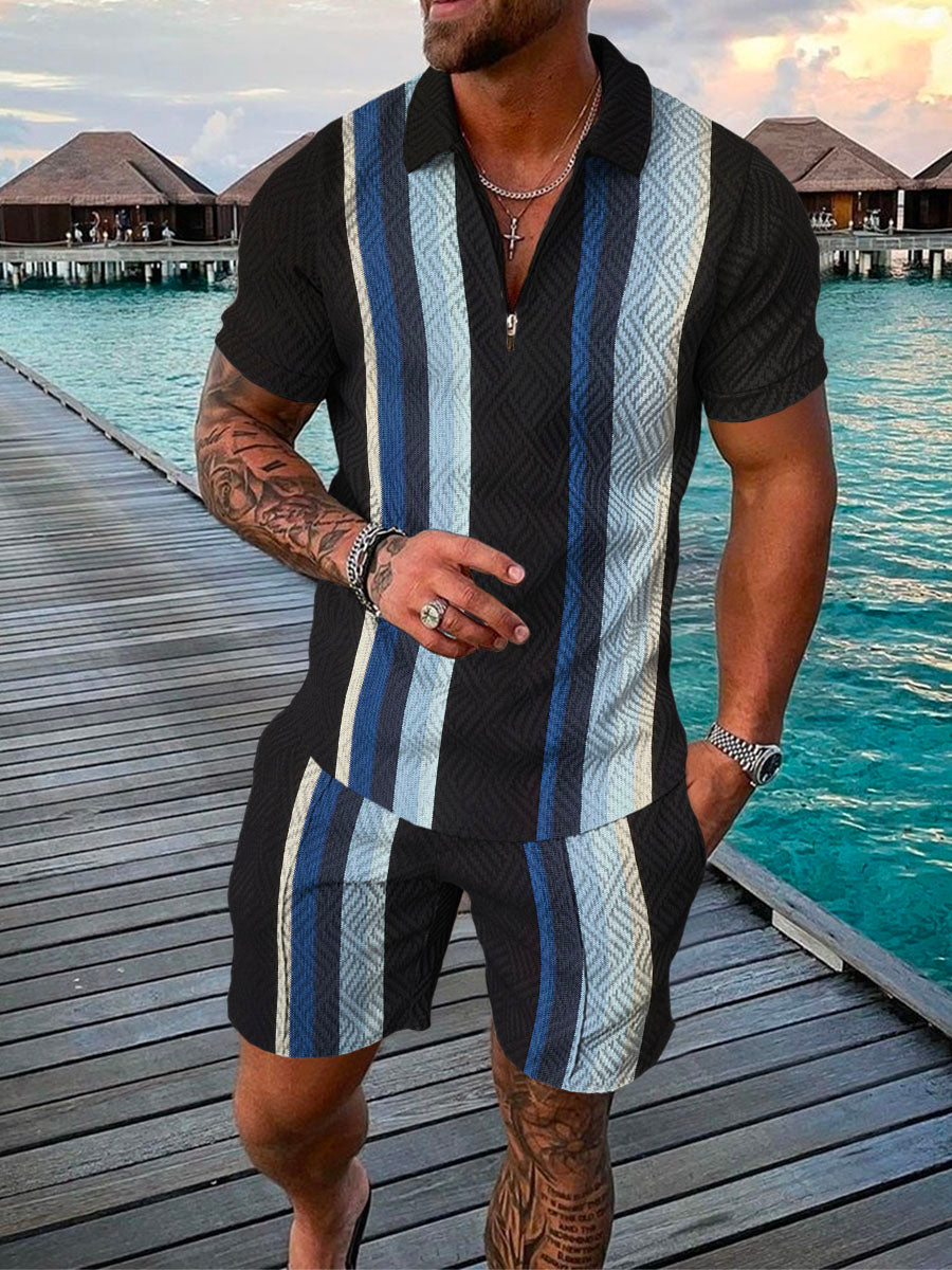 Men's Summer Fashion 3D Printed Short Sleeve Geometric Zip Lapel Shirt Set
