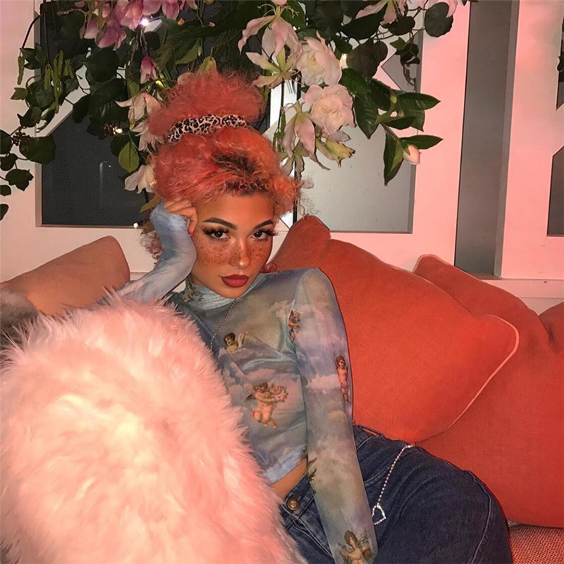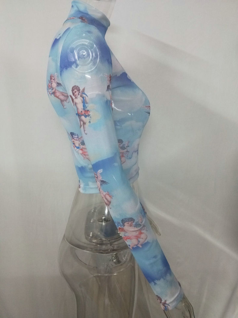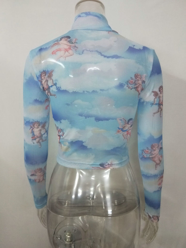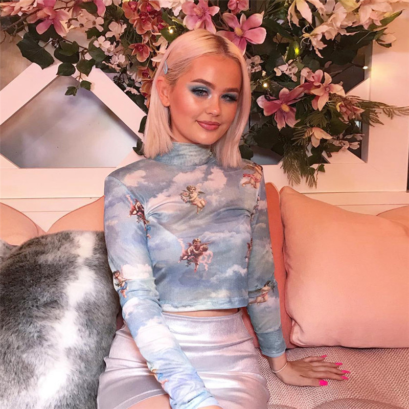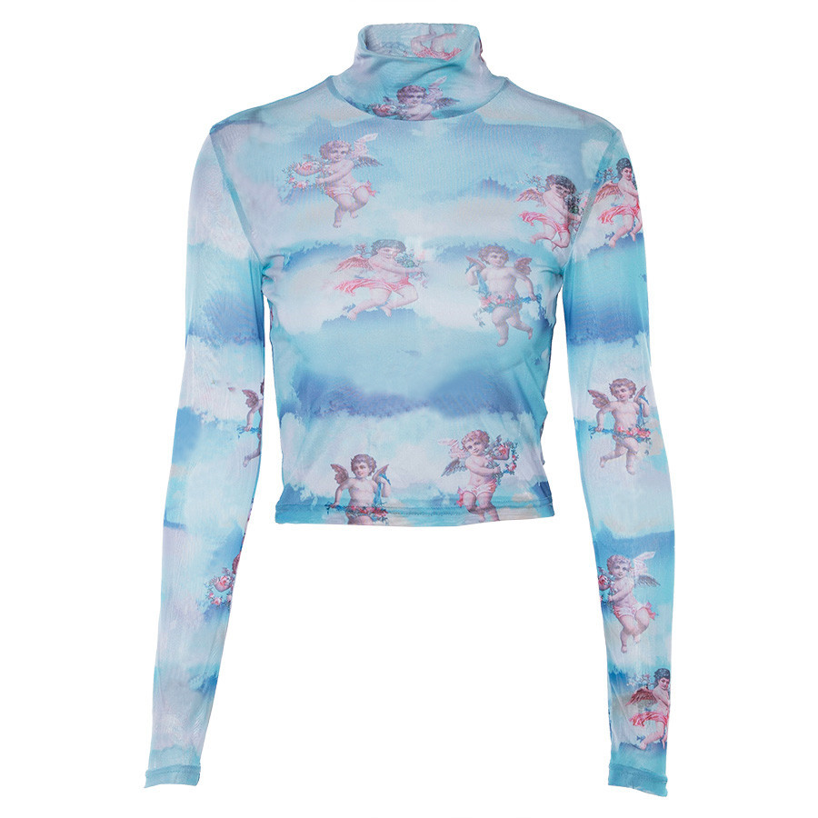 Macheda Casual Winter New Women's Slim High Collar Long-Sleeved Mesh Perspective Cartoon Printing Short t Shirt Top