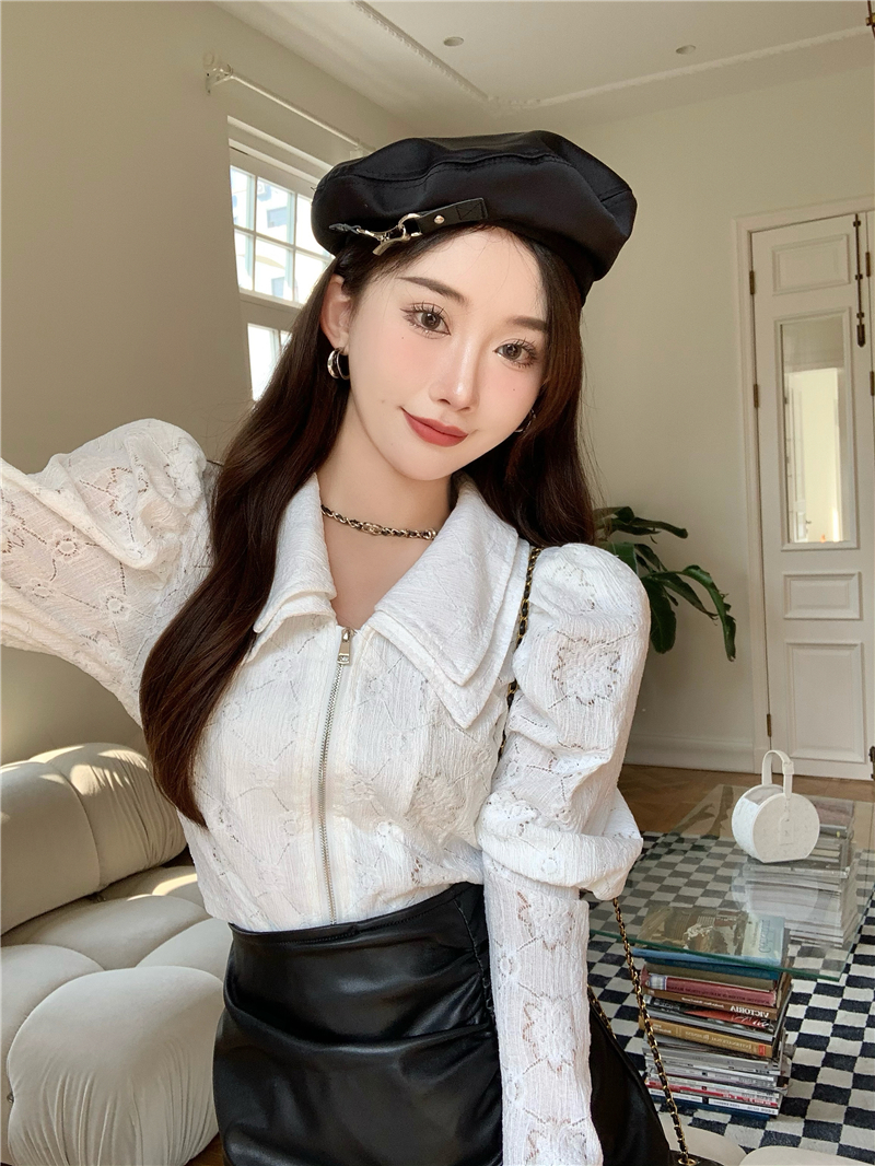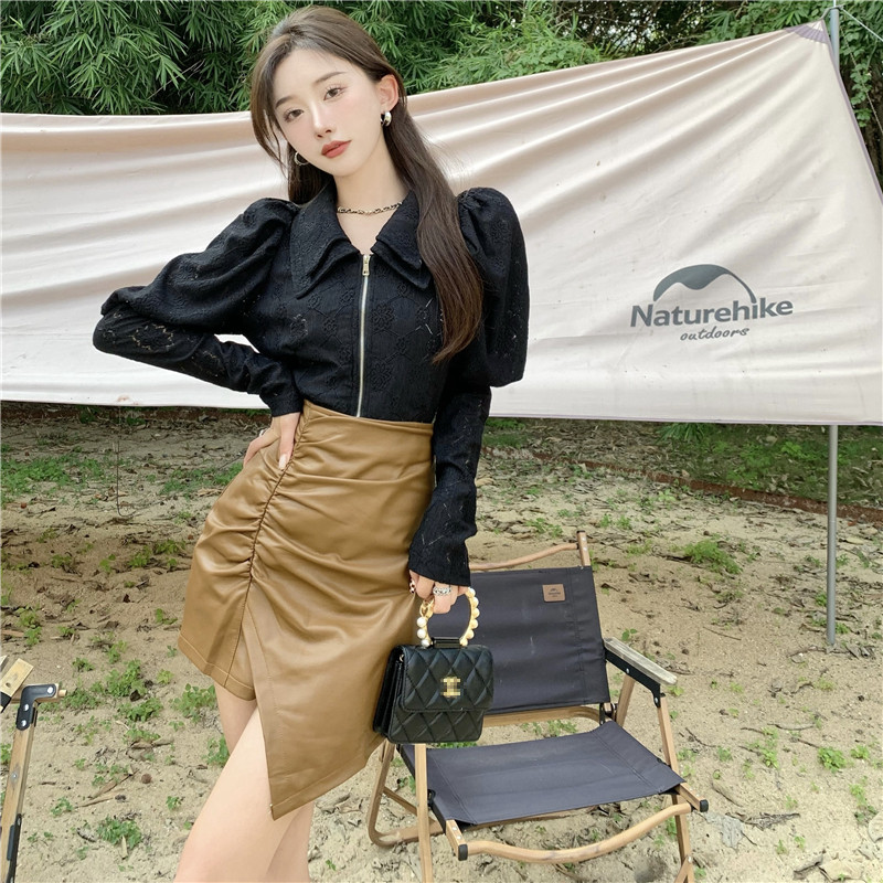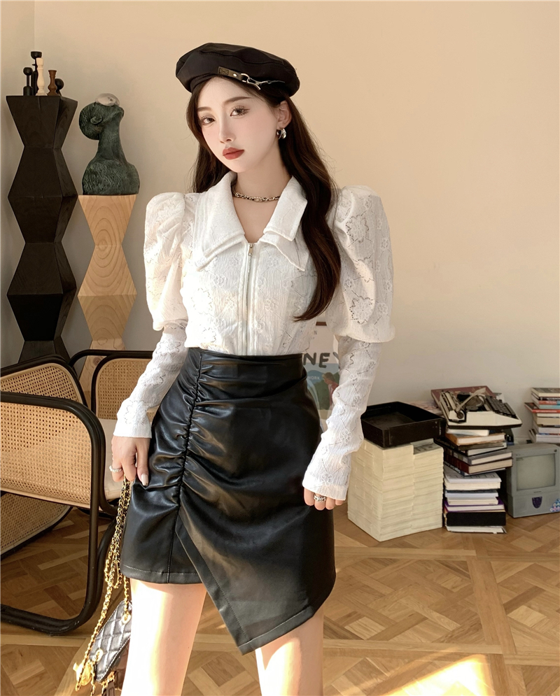 Color classification: White bottoming shirt, black bottoming shirt, black leather skirt