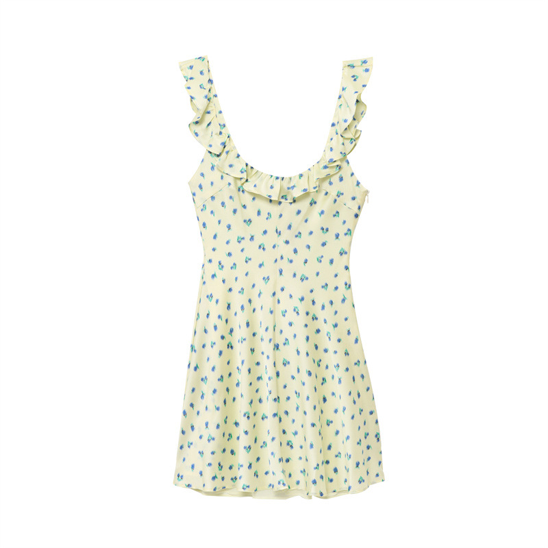 French Retro Silk Satin Texture Printed Round Neck Dress