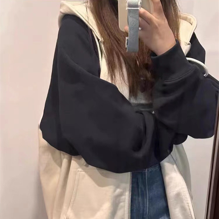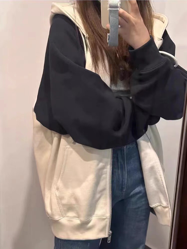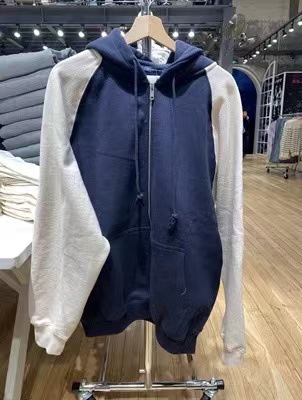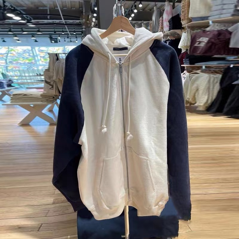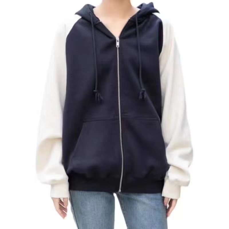 Navy Blue Beige Raglan Sleeve Multicolor Hoodie Coat