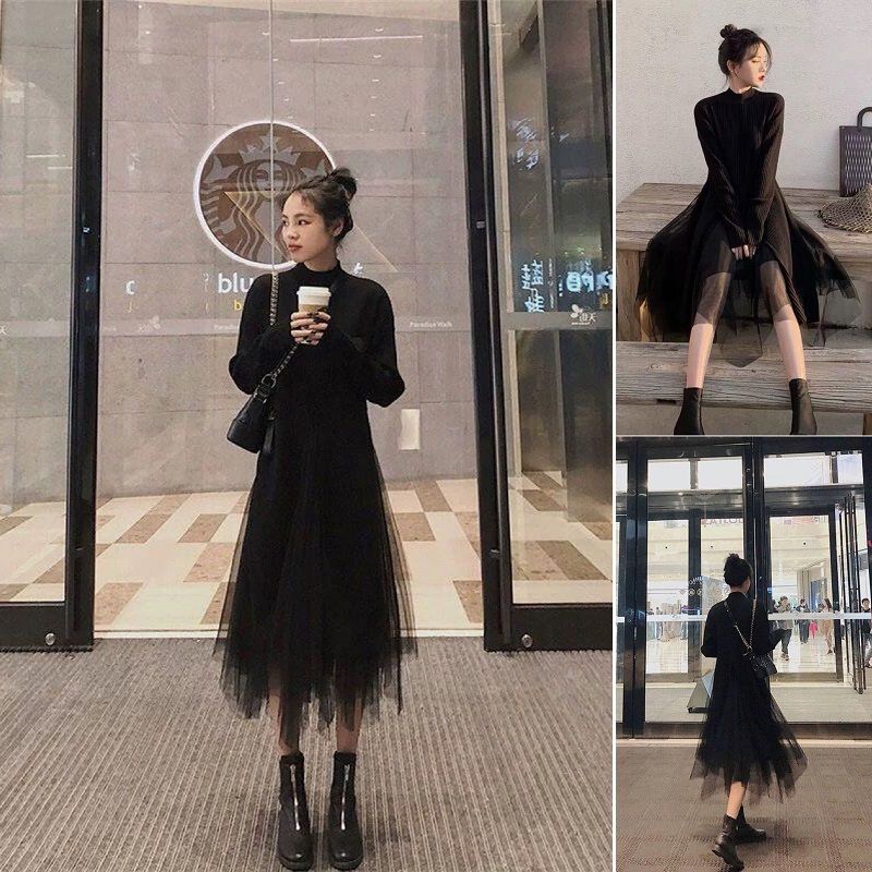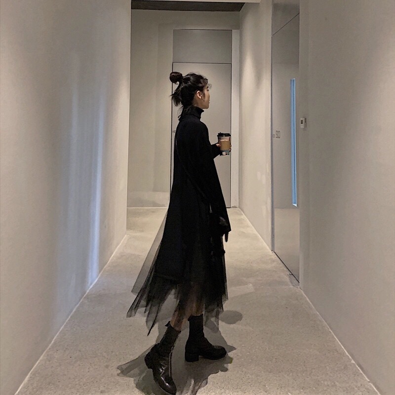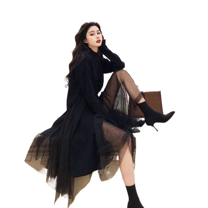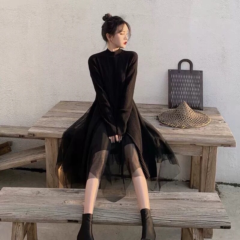 Color: Black collar sweater thin fabric dress [middle collar two-piece set]]