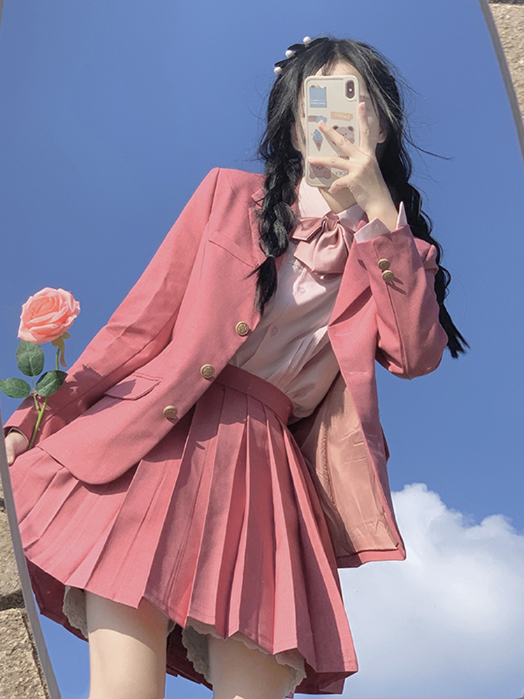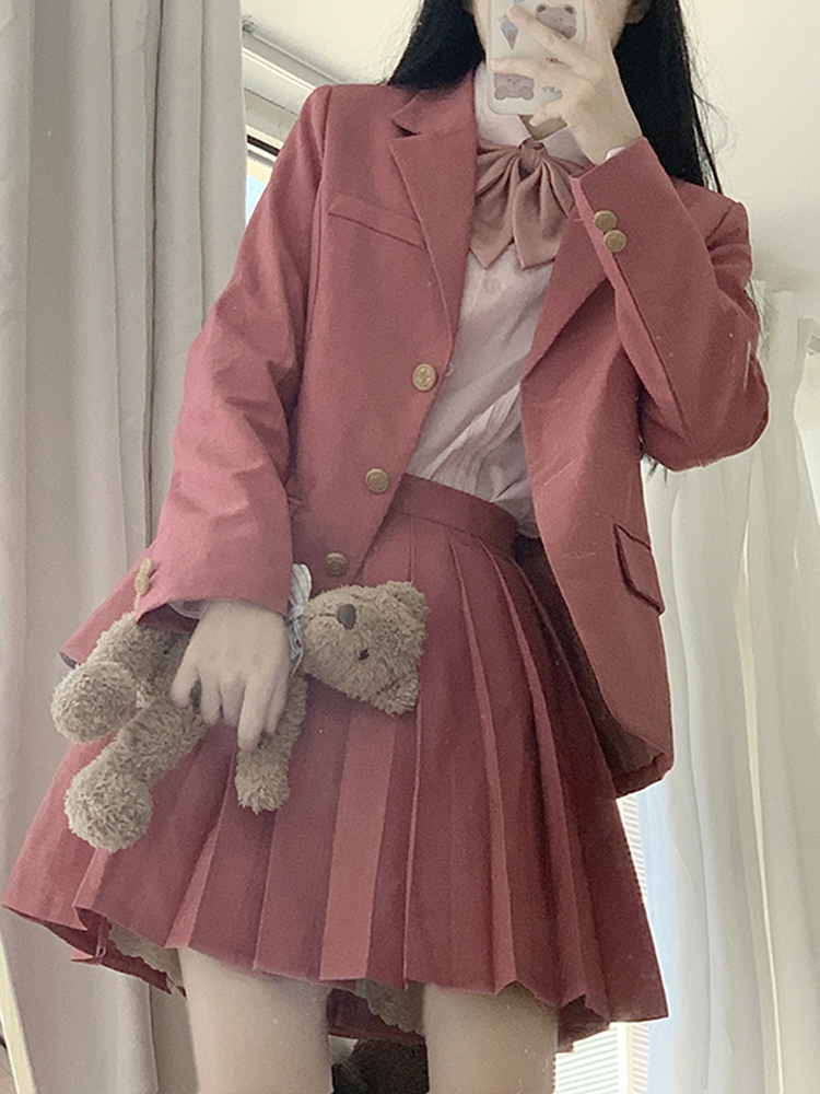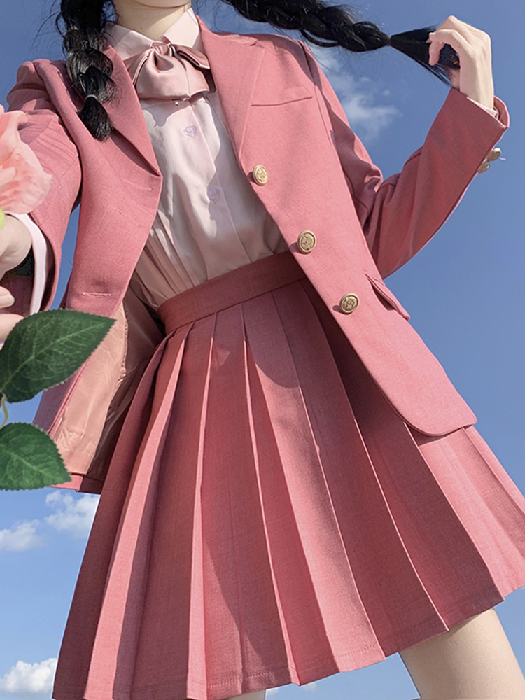 Color classification: Small raspberry suit jacket, small raspberry pleated skirt, pink long-sleeved shirt + bow tie, small raspberry jacket + pink shirt + lower skirt + bow tie