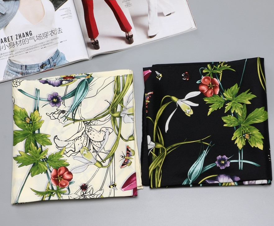 Silk / mulberry silk / SILK-twill.90CM * 90CM (about 88CM after curling).Features: The scarf of twill fabric is hard and drape in texture, not as smooth as satin, it needs to be ironed.