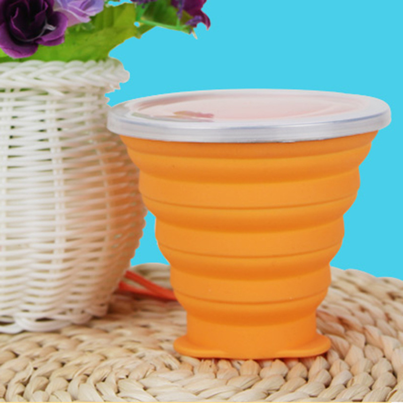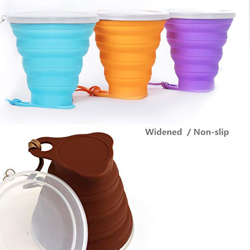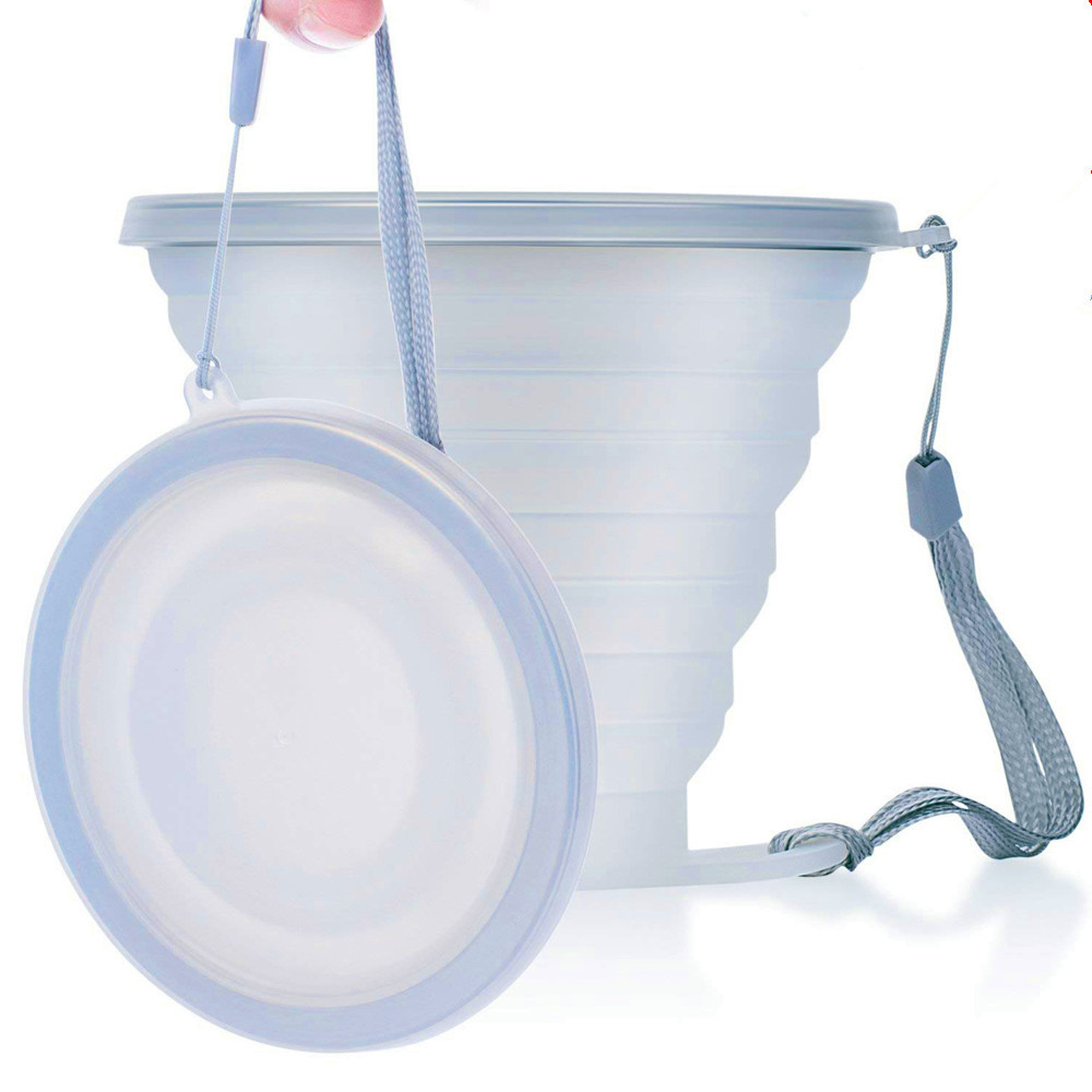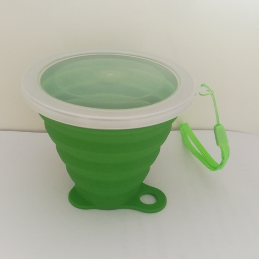 Foldable travel mug with food grade silicone, stainless steel frame and plastic lid, BPA free, safe and healthy.