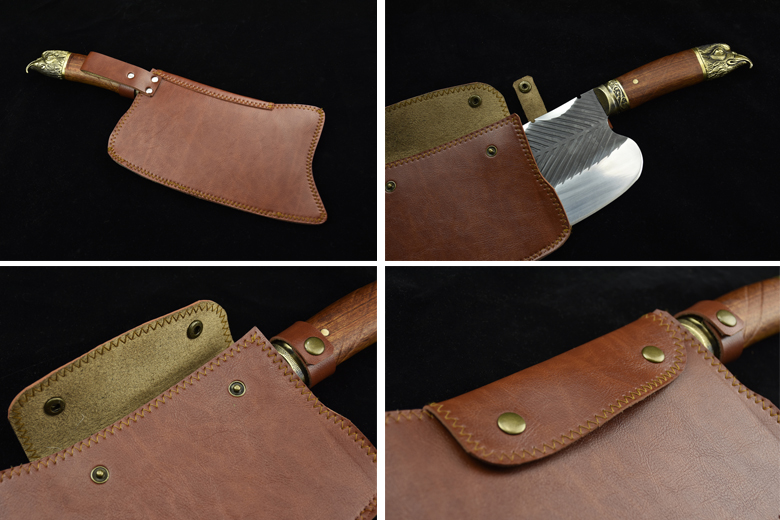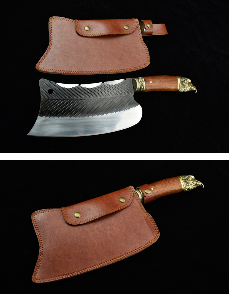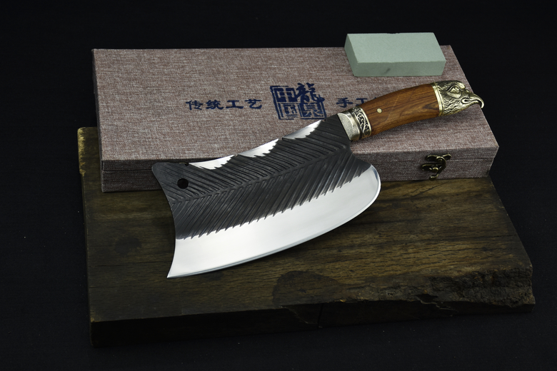Full length: 37cm Blade length: 23.5cmHandle length: 13cm Blade width: 10.7cmThickness: 0.5cm Blade material: high manganese steelHandle material: rosewood, fittings: brassNet weight: 1kg