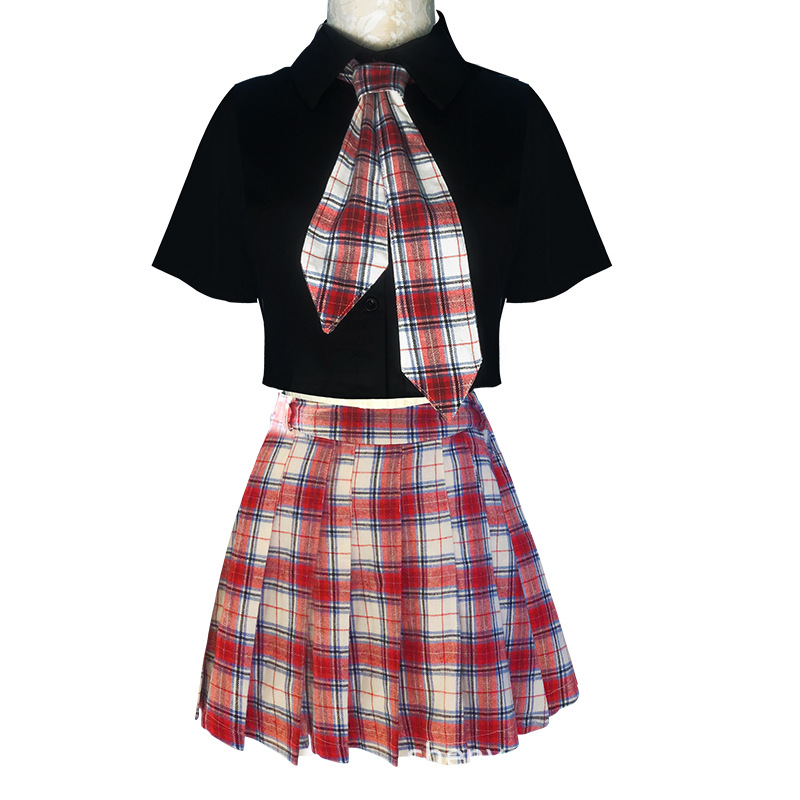 D; 845-4 black top + red and white plaid skirt