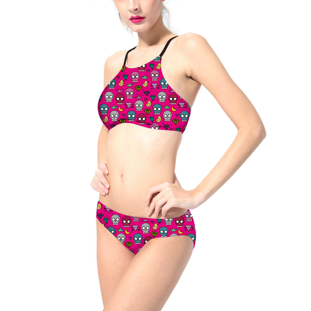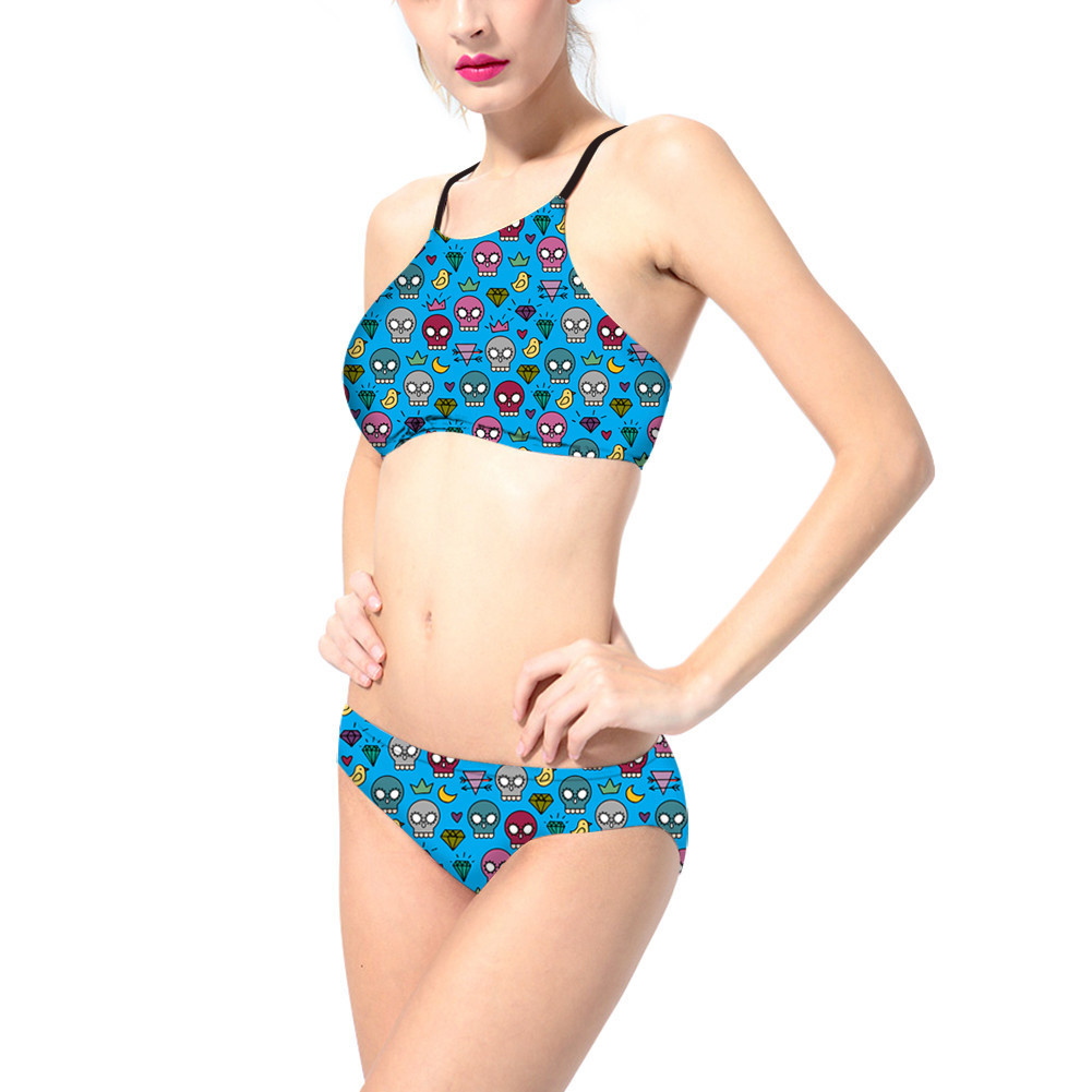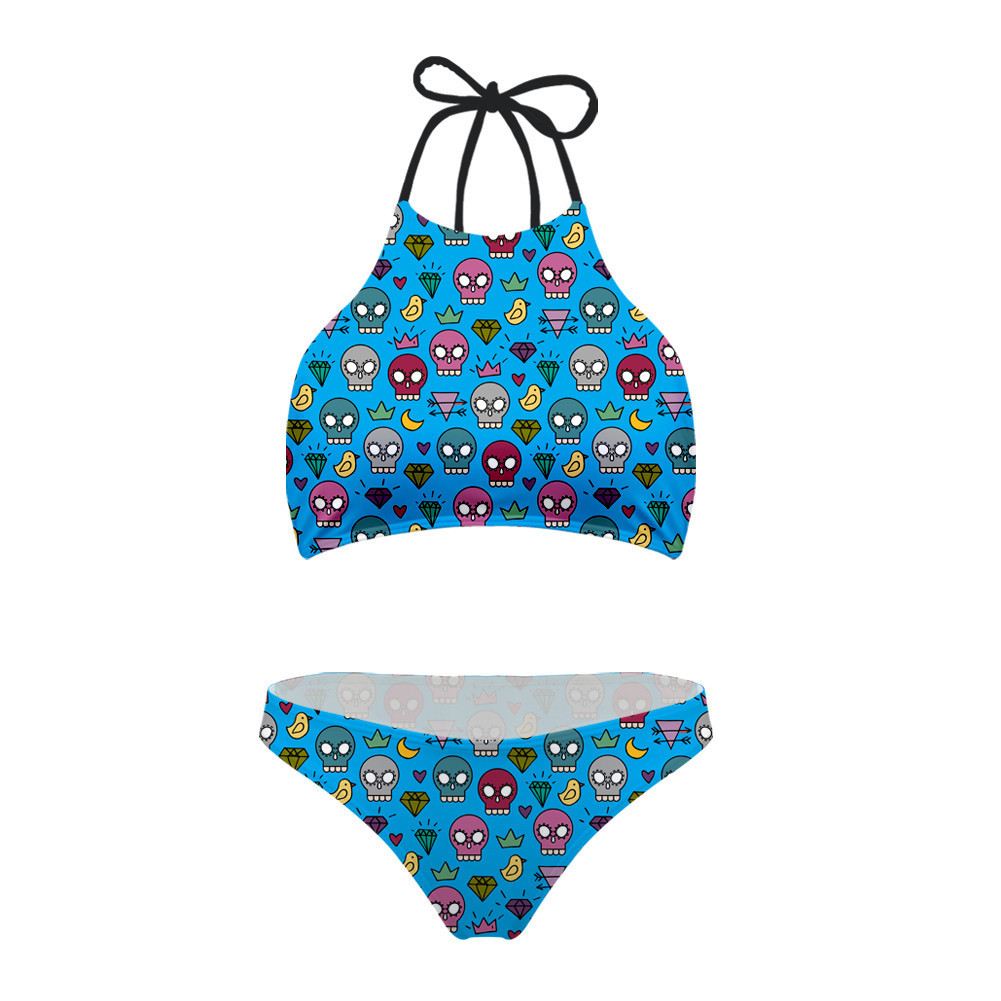 Fashion cut 2 piece swimsuits feature halter bikini top, tie at neck and back
