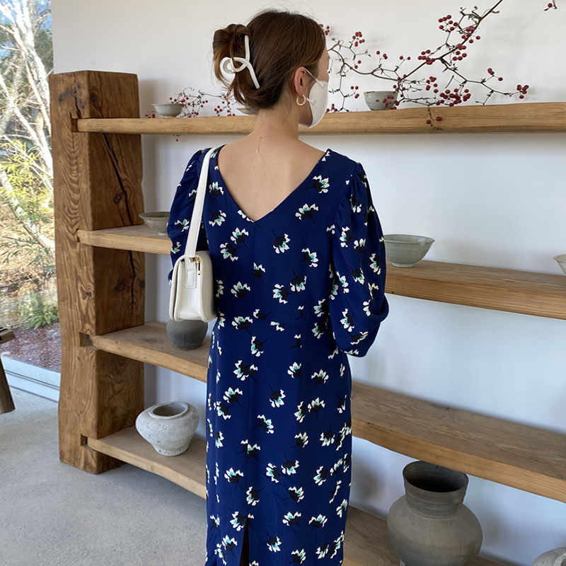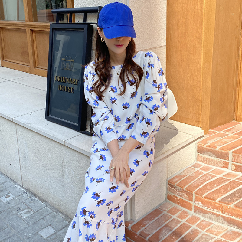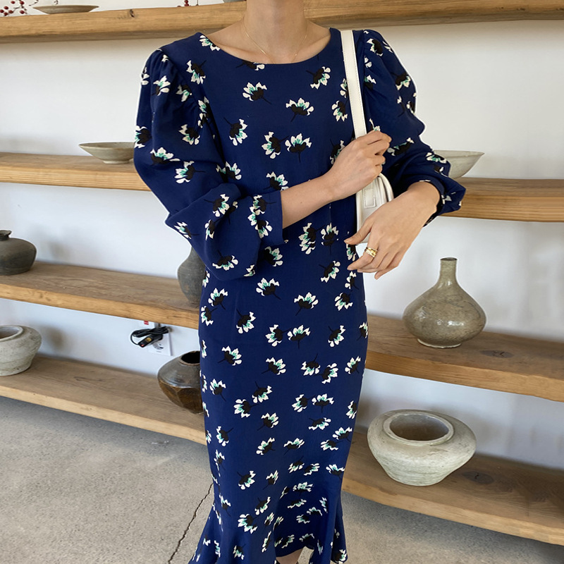 Packing: Elegant flower round neck two-wear pleated waist long-sleeved fishtail dress x1