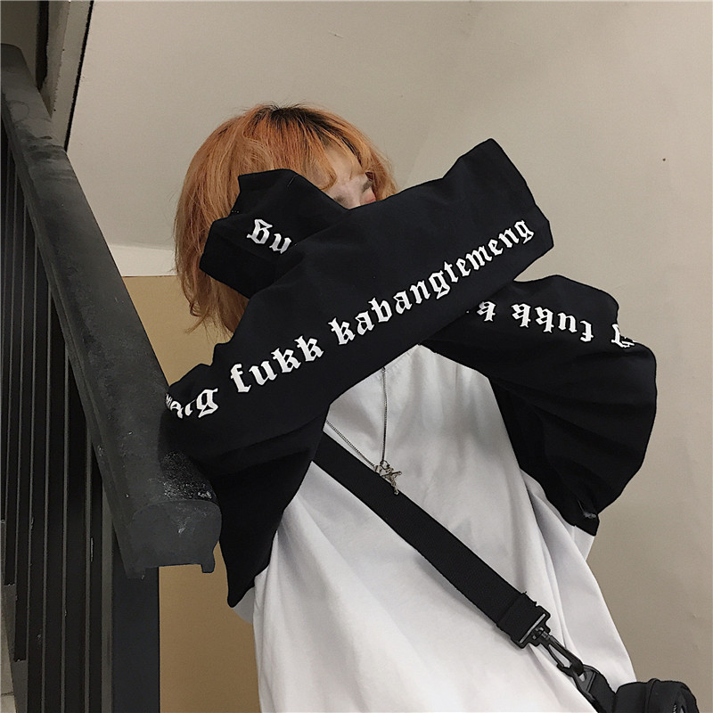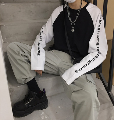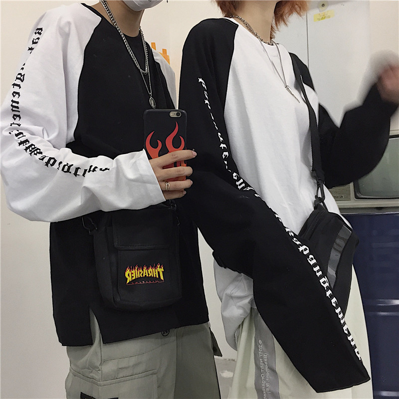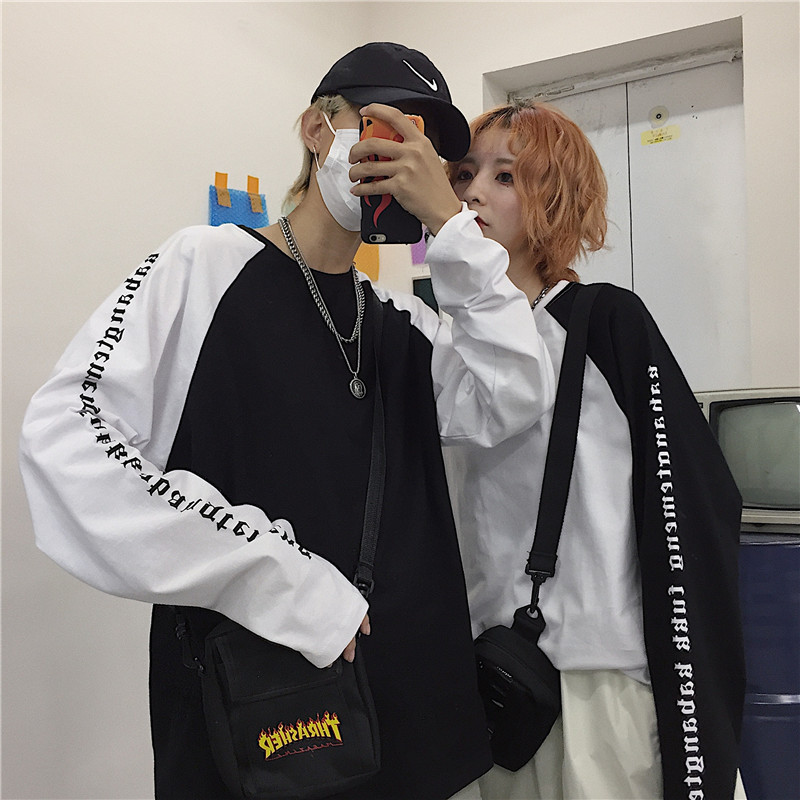 Korean retro arm Sanskrit print colorblock raglan sleeve long sleeve