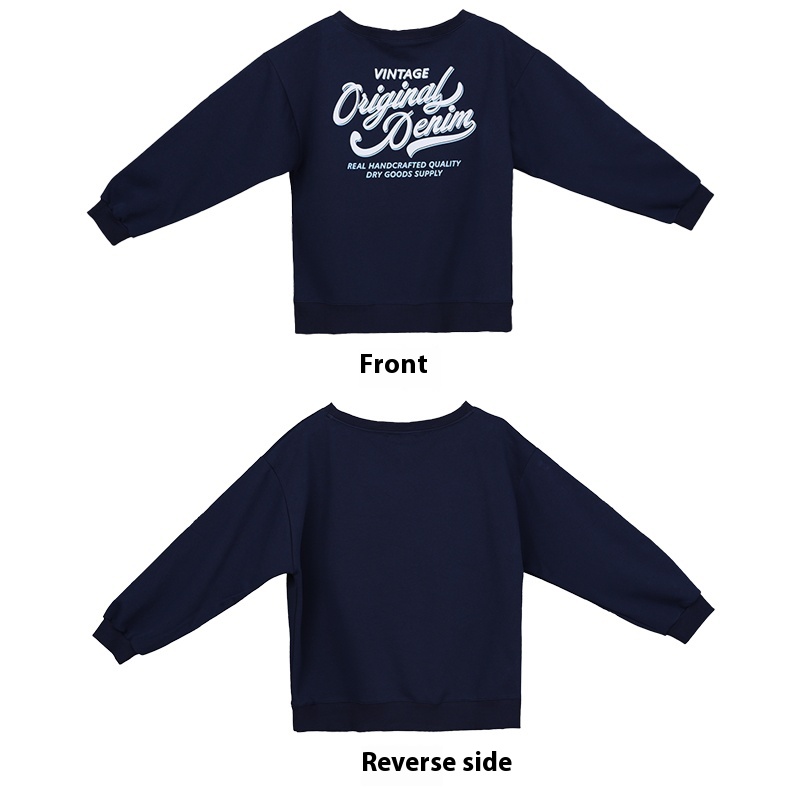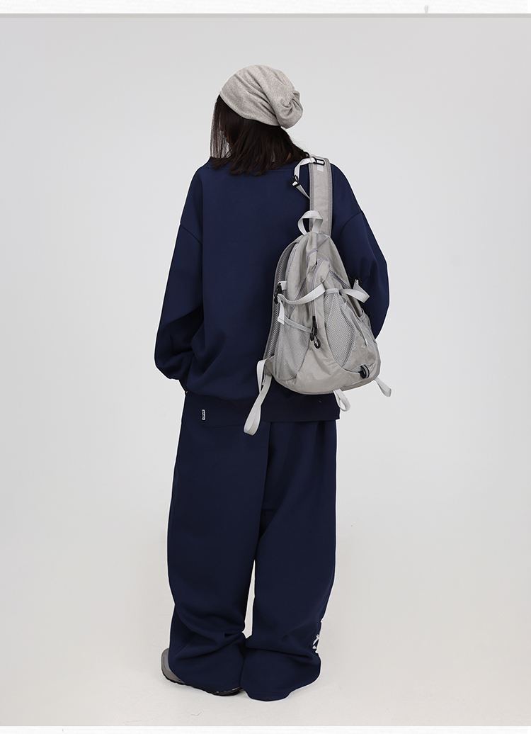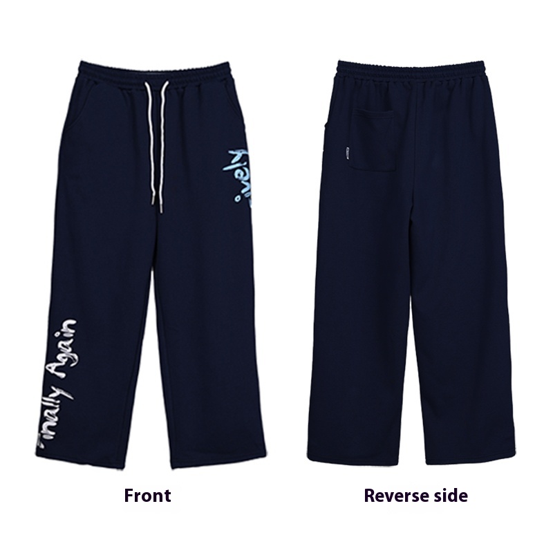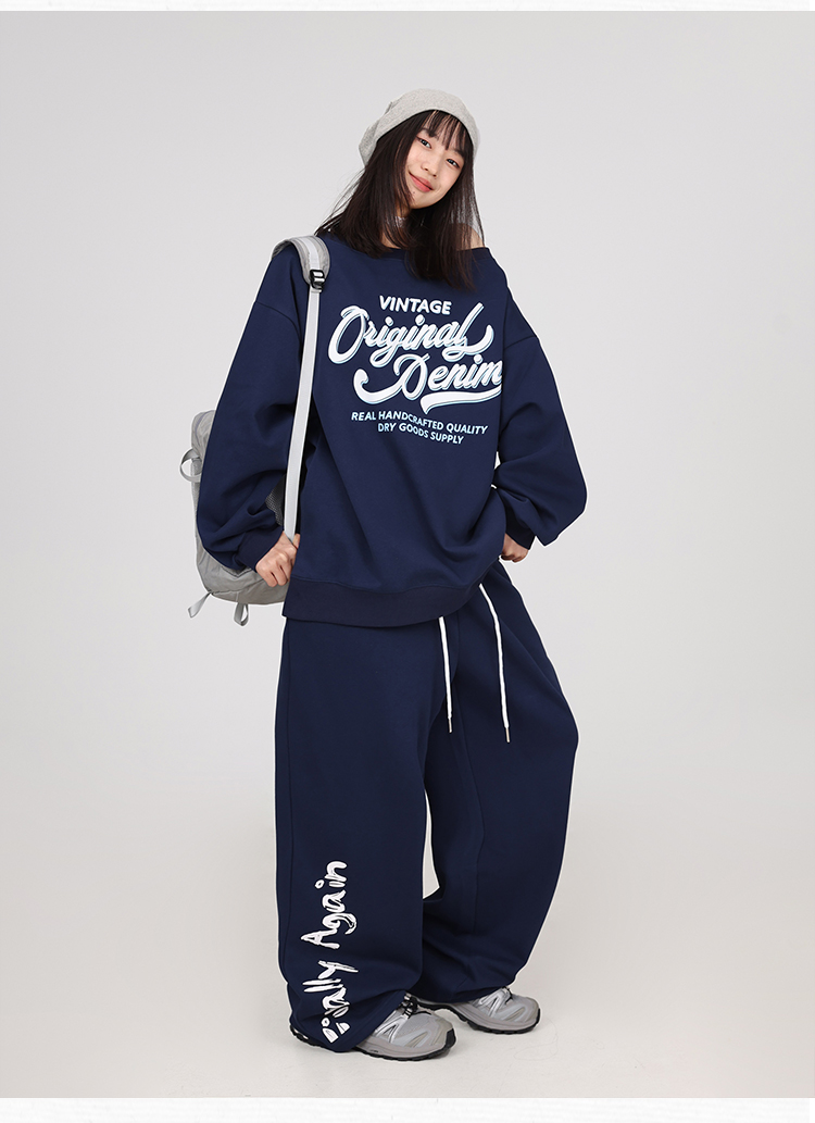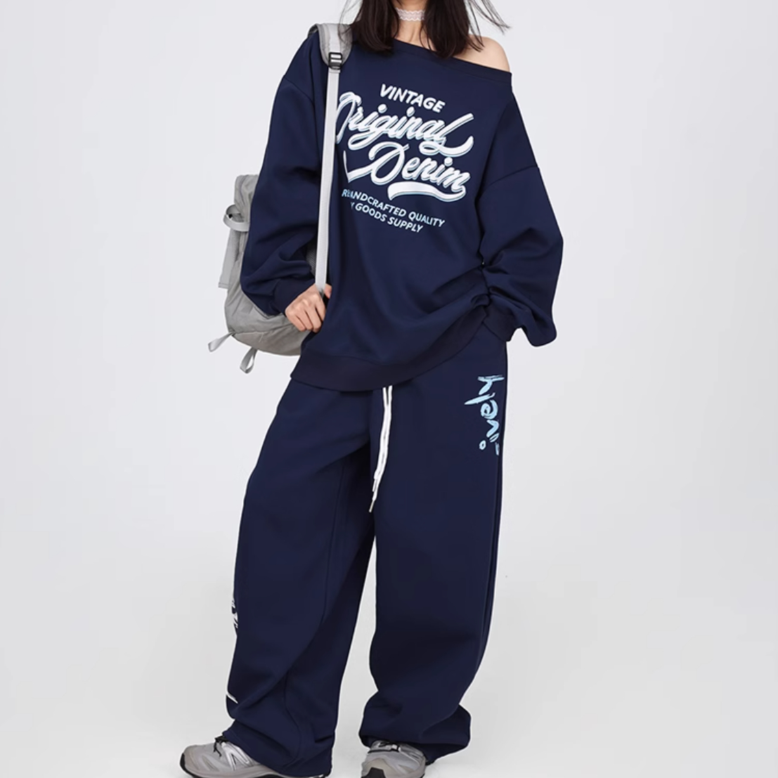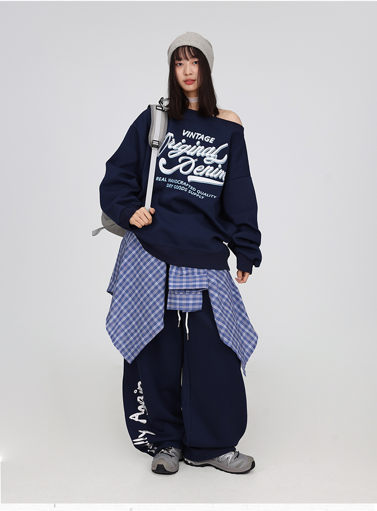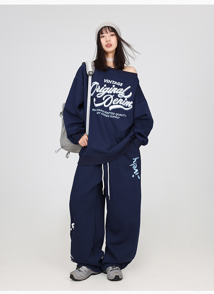 Color classification: navy blue off-shoulder sweater, navy blue American trousers,