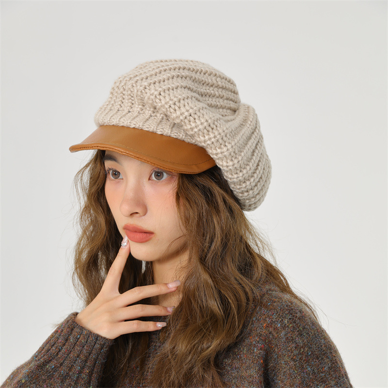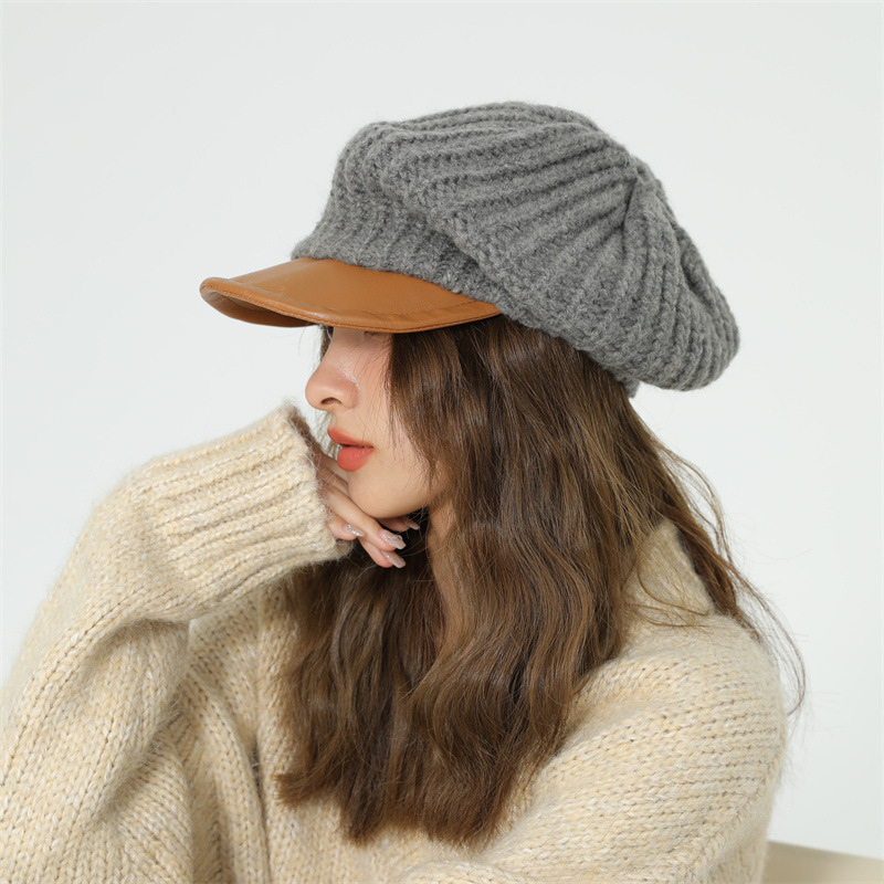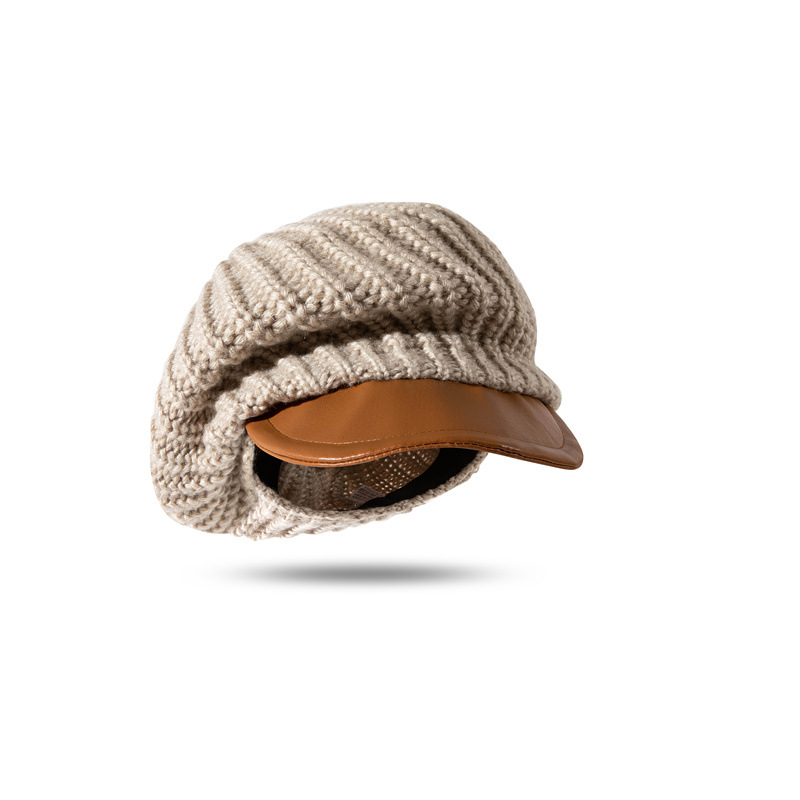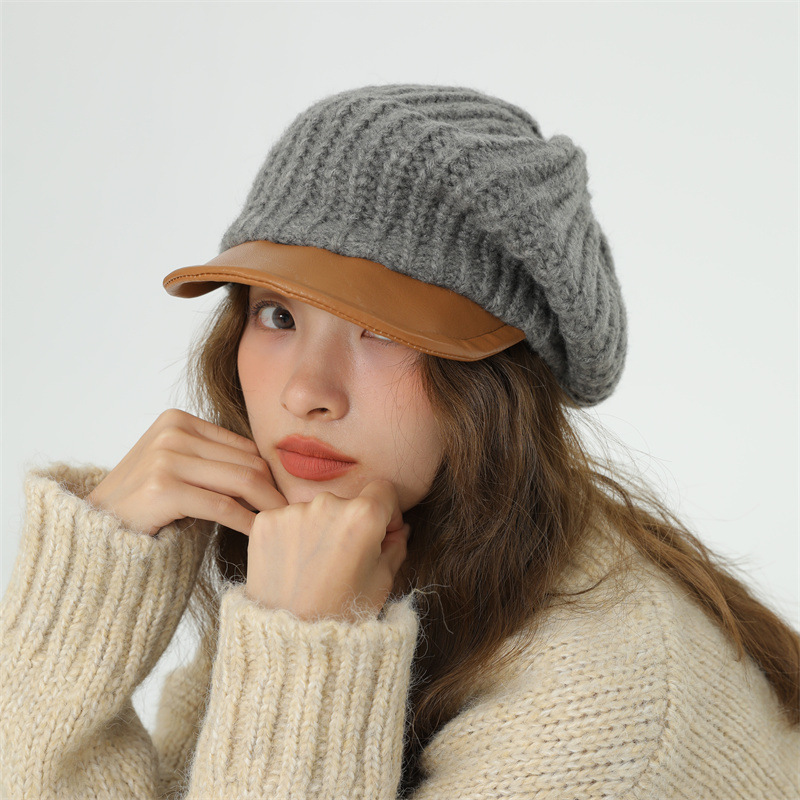Material: woolPattern: color blockingPopular element: knitted leather hat brimColor: khaki, greySize: One Size