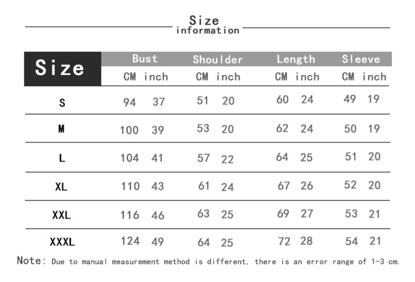 Note: 1. Asian sizes are 1 to 2 sizes smaller than European and American people. Choose the larger size if your size between two sizes. Please allow 2-3cm differences due to manual measurement. 2. Please check the size chart carefully before you buy the item, if you don't know how to choose size, please contact our customer service. 3.As you know, the different computers display colors differently, the color of the actual item may vary slightly from the following images.