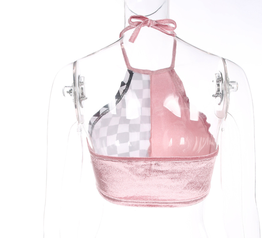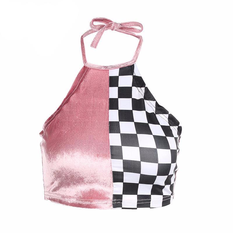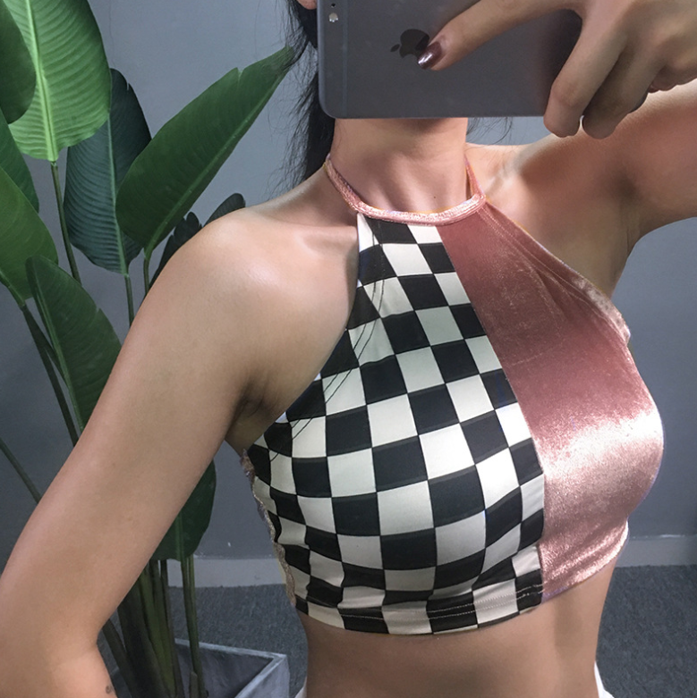 Sexy sling female summer wear hanging neck velvet stitching checkerboard vest