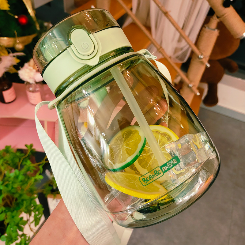 Cartoon fashion water bottle with shoulder strap, easy to carry.