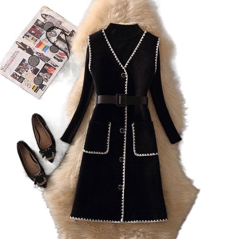 Color: blue [one piece of vest], White [one piece of vest], pink [one piece of vest], Black [one piece of vest], blue vest black sweater [two-piece set], white vest black sweater [two-piece set]], pink vest black sweater [two-piece set], black vest black sweater [two-piece set], black sweater [single piece], white sweater [single piece], apricot sweater [single piece]]