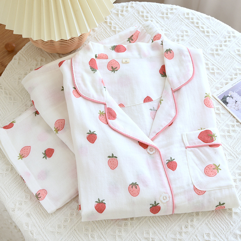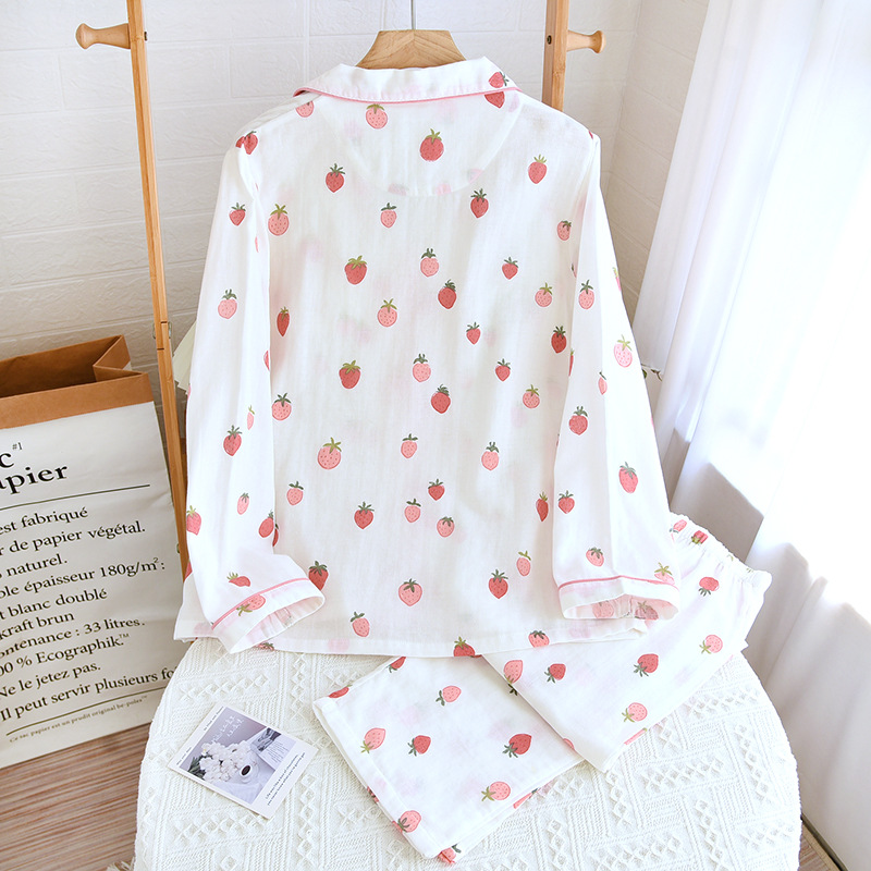 Product information: Fabric name: double-layer gauze Color: Women's gauze long printed strawberry Main fabric composition: Cotton Size: M,L,XL Function: casual, breathable, sleep, home, comfortable, can be worn outside