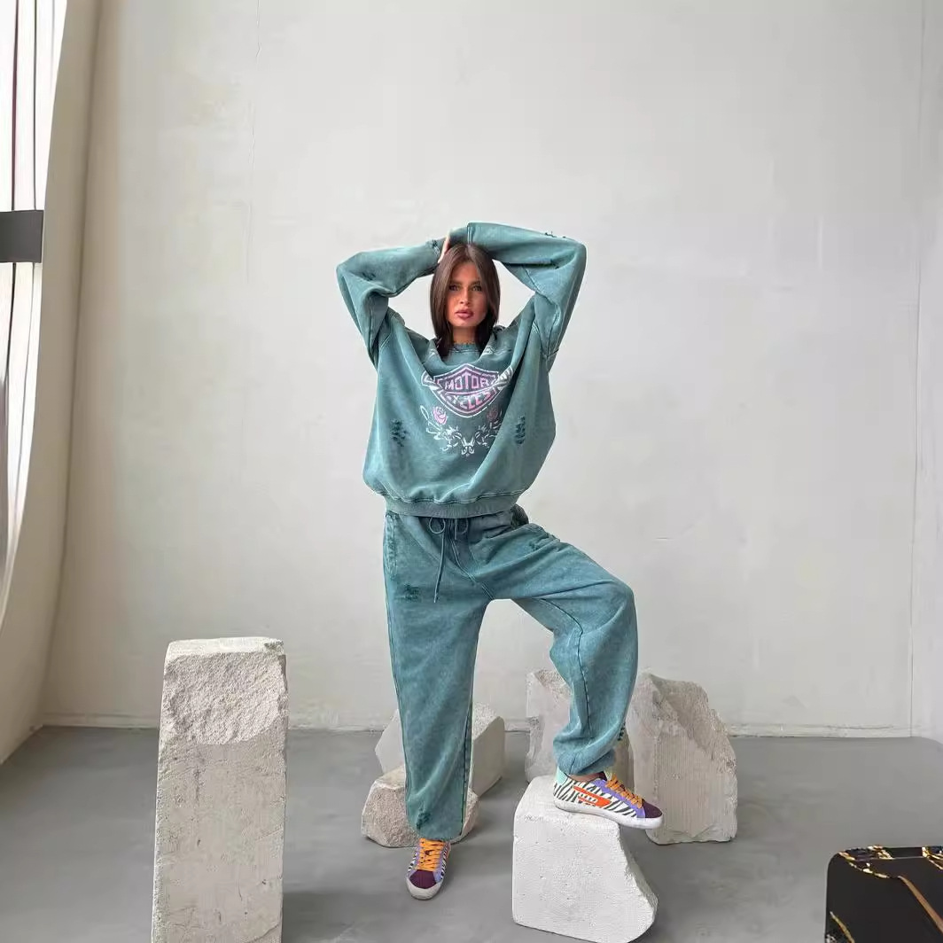 Product information: Pattern: Letters Color: green Pants length: trousers Size: S,M,L Popular elements: Distress Main fabric composition: Cotton Applicable Gender: Female Sleeve length: long sleeve Process: Printing (Unit: cm)