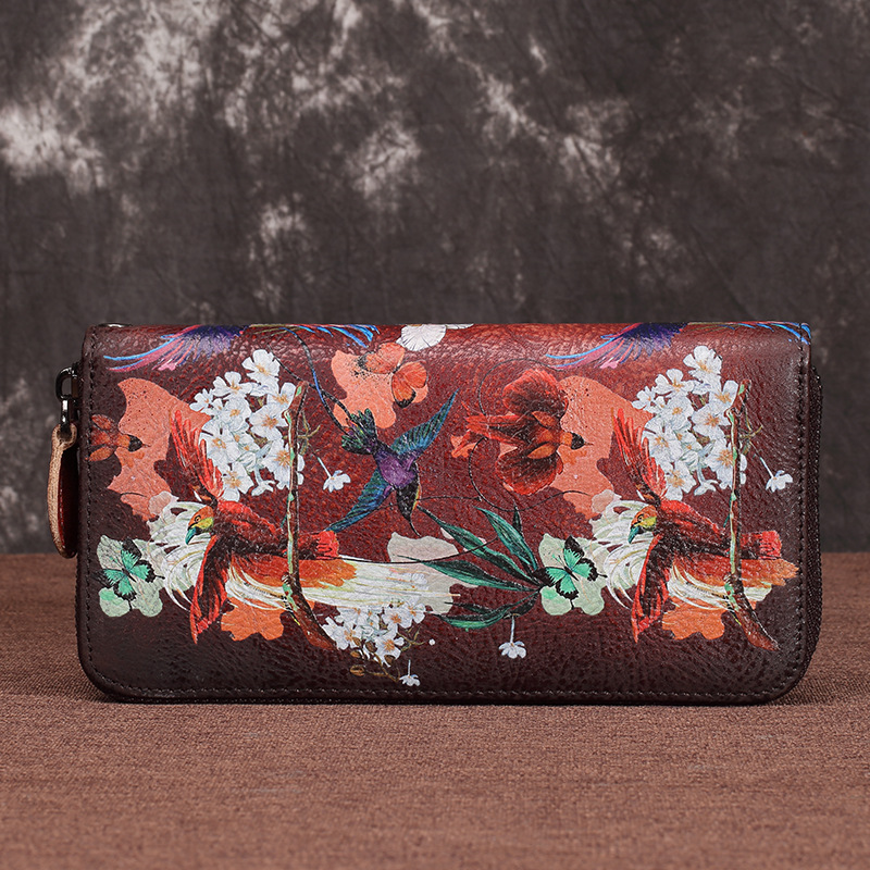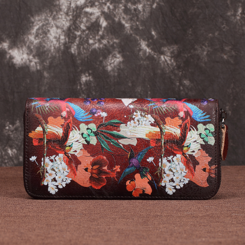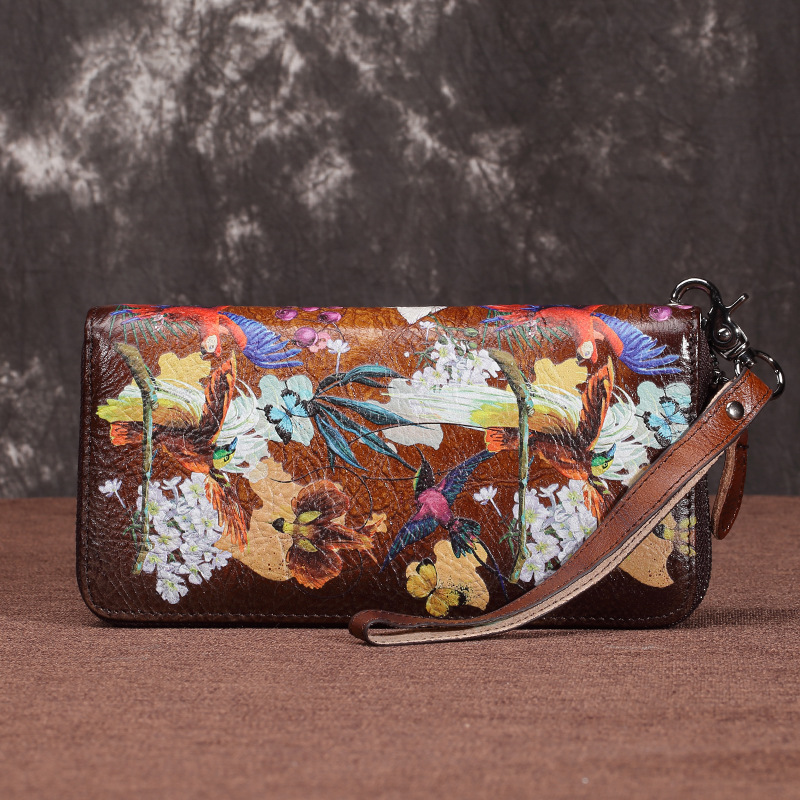 Material: LeatherCortex features: first layer cowhideOpening method: zipperPopular elements: retroPattern: FlowerHardness: medium to softSize: 19.5*10*2.5cm