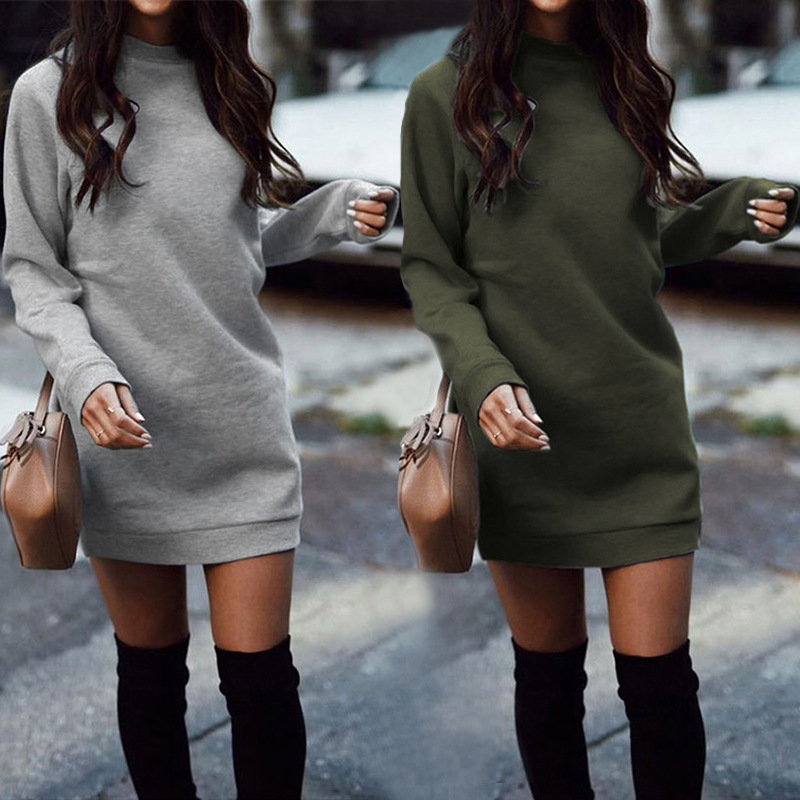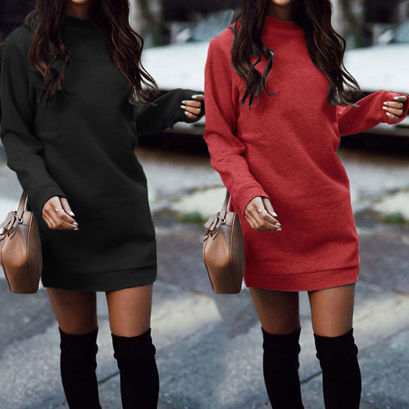 Sweater dress round neck solid color long-sleeved women's dress