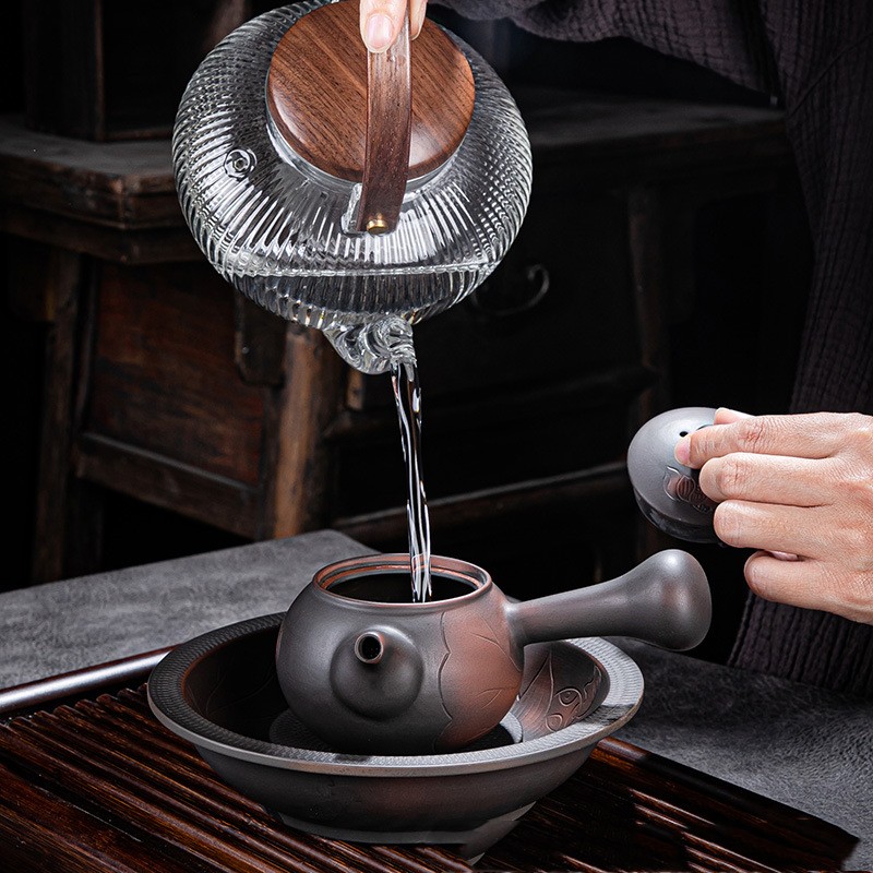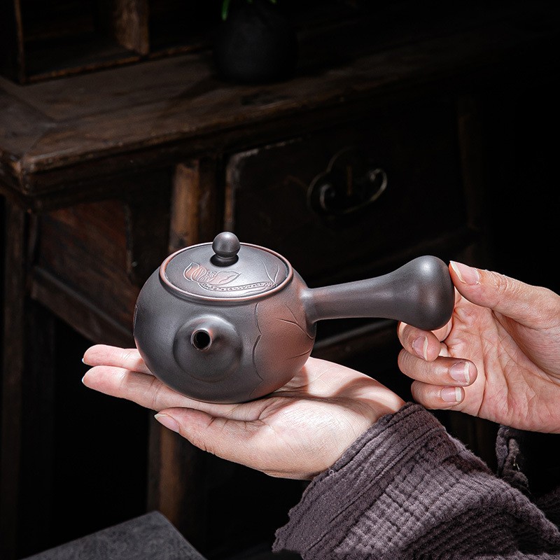 Purple pottery antique side handle pot: specification: 15cm long * 7.5cm high, capacity: 150ml