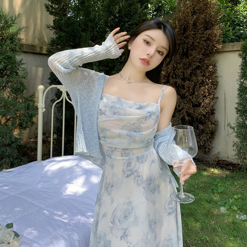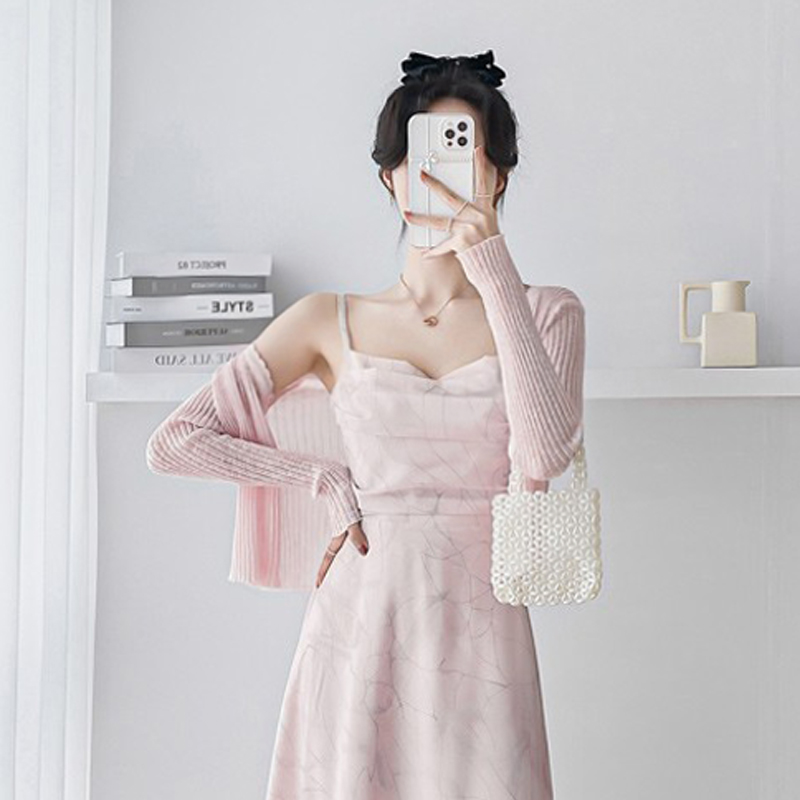 Color classification: light blue cardigan pink cardigan light blue skirt with suspenders pink cardigan+light blue skirt with suspenders a set of pink cardigan+pink skirt with suspenders.